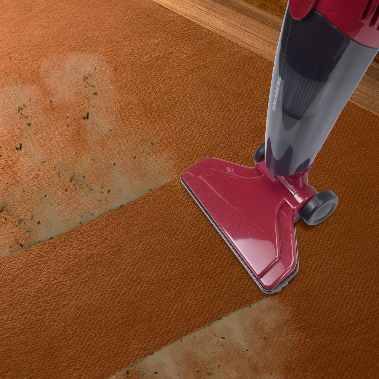 Вертикалната прахосмукачка без торба от Hausberg, модел HB-2025,   може да се използва във всеки ъгъл на къщата. Дръжката е лесна за боравене, освен това се сваля. Може да се съхранява както хоризонтално, така и вертикално. Може да се използва и като ръчна прахосмукачка, като премахнете металната дръжка. Вертикалната прахосмукачка е еволюция на модела ръчна прахосмукачка, която ви позволява да поддържате къщата чиста всеки ден.