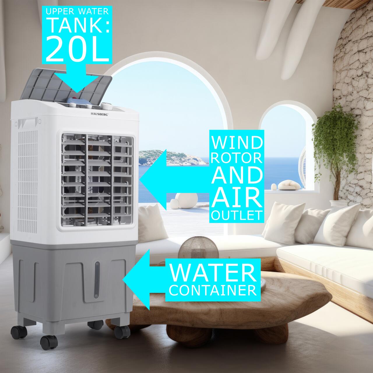 Вятърният ротор осигурява силен и ефикасен въздушен поток, а 4-те включени колела предлагат пълна мобилност, което прави този модел идеален за употреба в дневни, офиси, търговски пространства или покрити тераси.