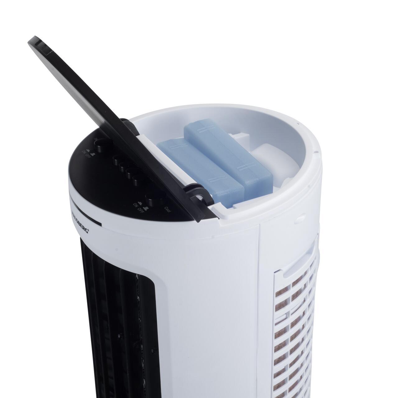 С резервоар за вода от 7,8 литра , охлаждаща подложка тип „пчелна пита“ и вътрешен воден цикъл за многократна употреба, този уред съчетава производителност с грижа за околната среда. Възползвате се от 3 настройки на скоростта , автоматично осцилиране на 60° и включен леден пакет за бързо и ефикасно охлаждане.
