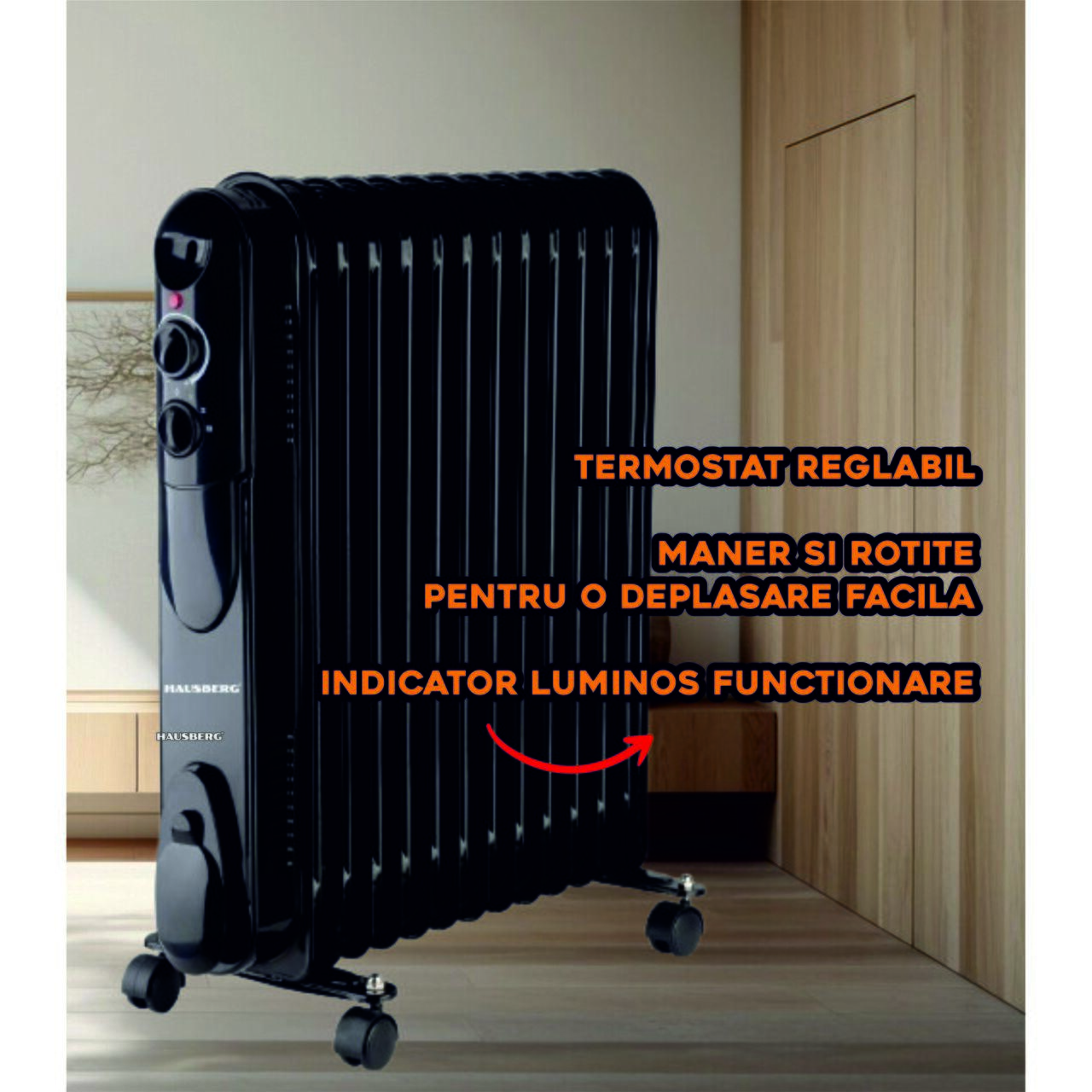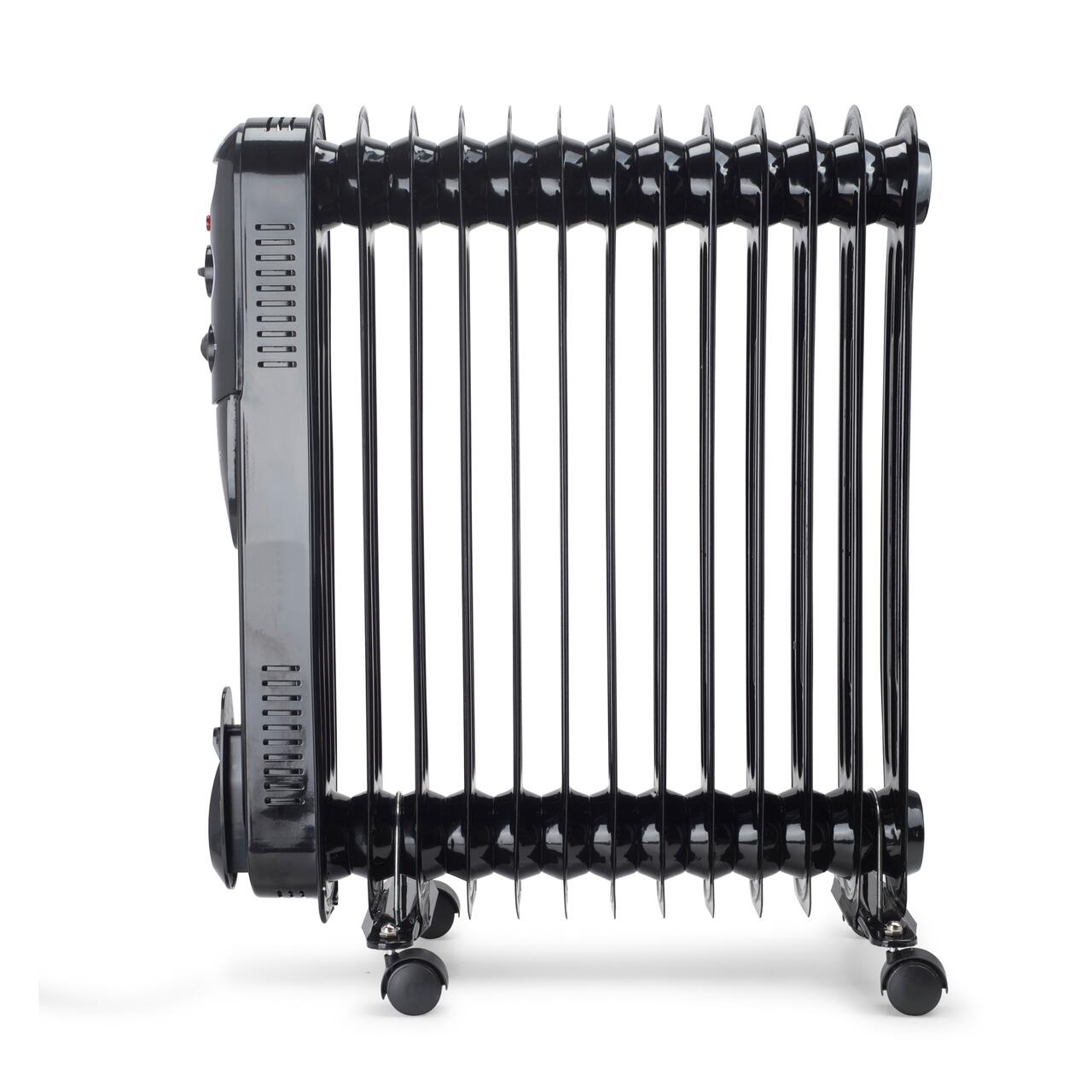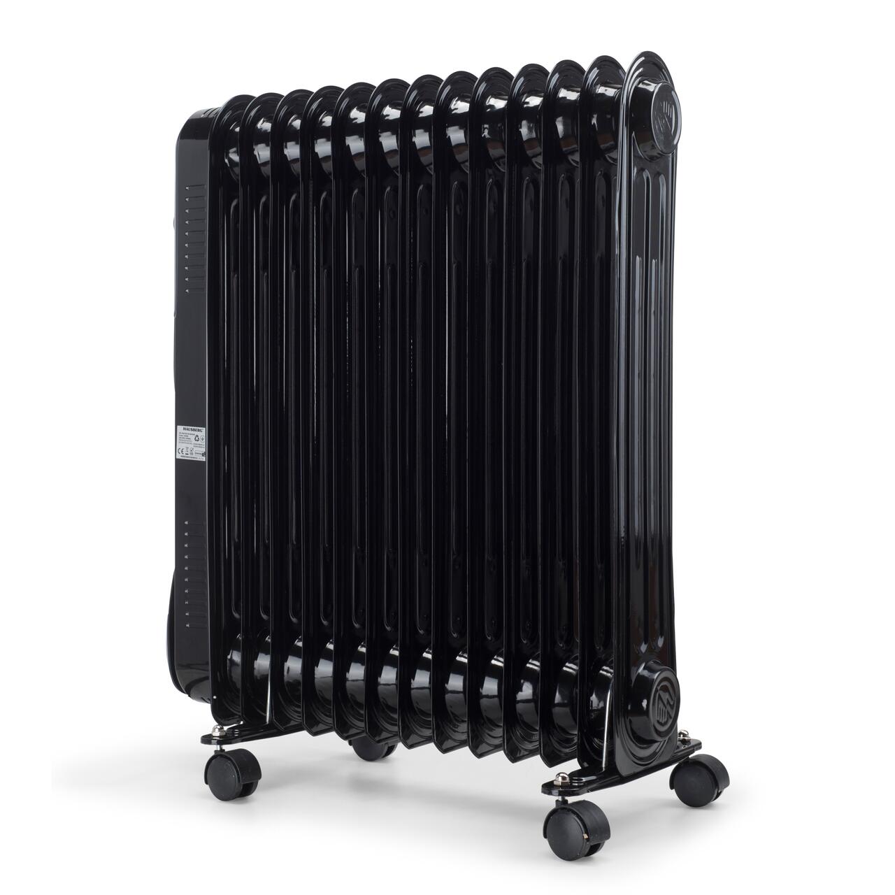 Електрически нафтов нагревател HAUSBERG HB-8935, 3 степени, 1000-1500-2500 W, 13 елемента 110 mm x 580 mm, регулируем термостат, ръкохватка и колела за лесно преместване, светлинен индикатор за работа, черен