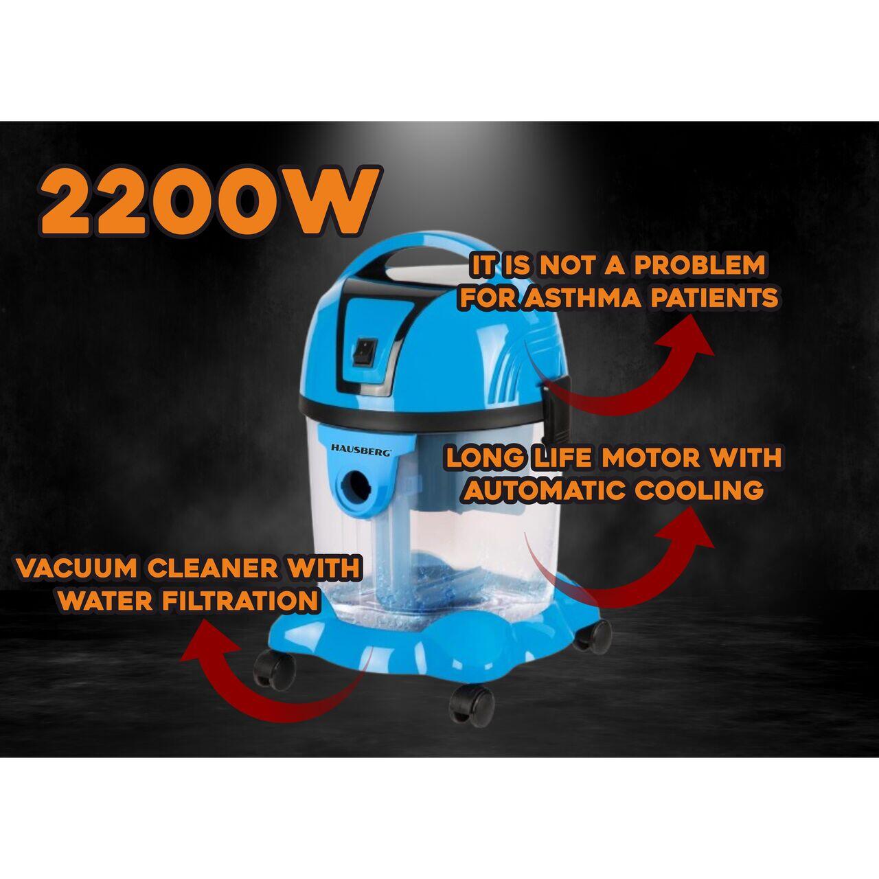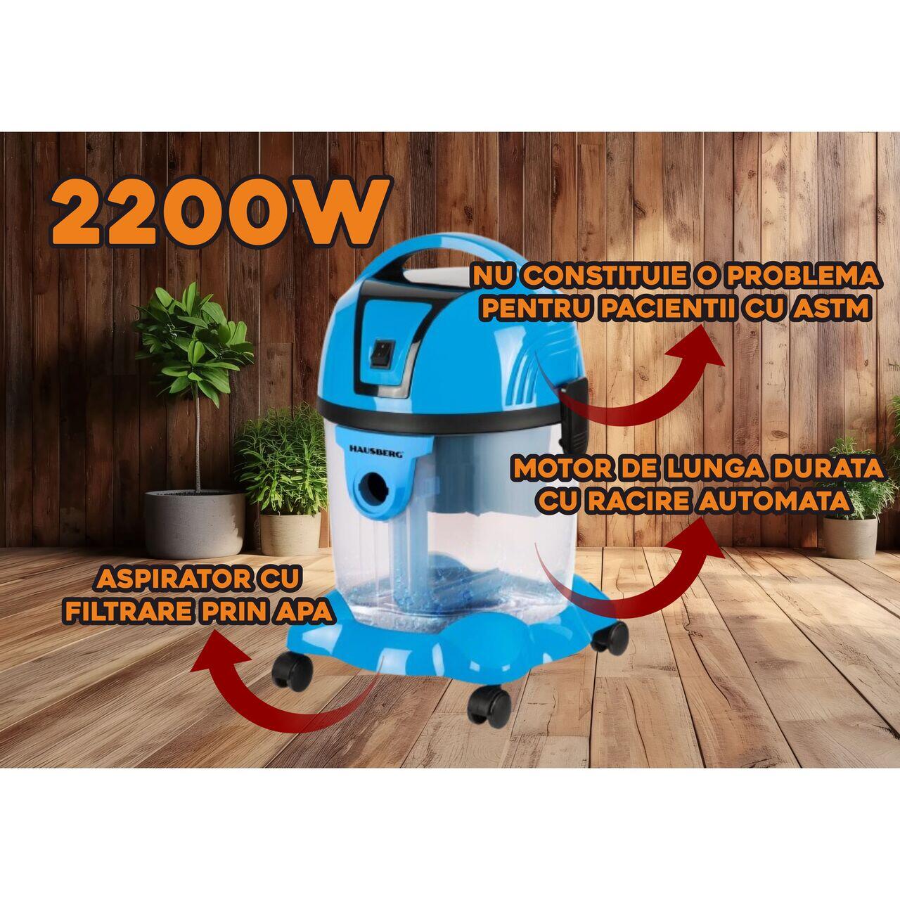Прахосмукачка с водна филтрация Hausberg HB-2830BL, Cuter 2200W, Капацитет 18L, Ниво на шум 81dB, Миещ се филтър, Телескопична метална тръба, Син