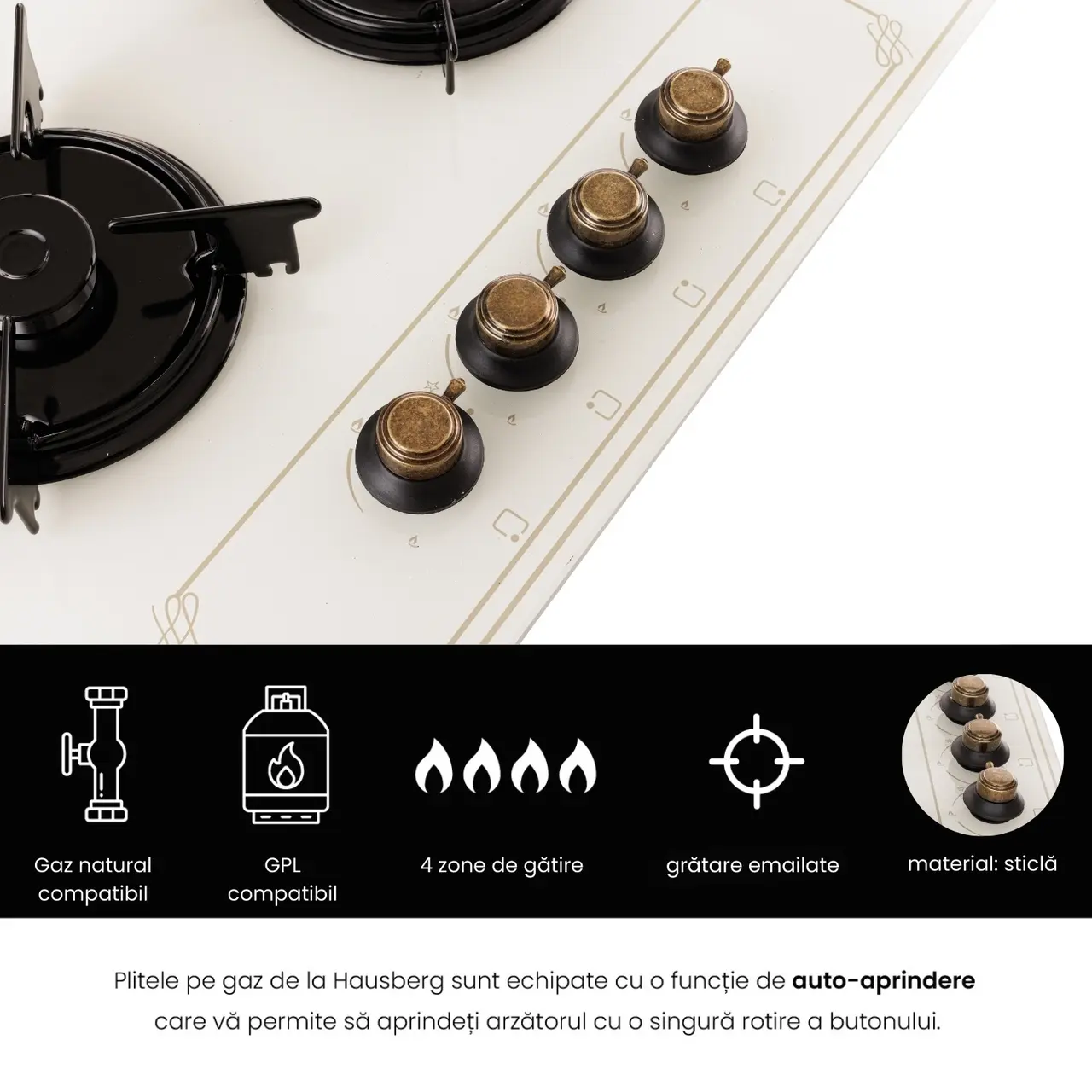 - Забравете кибрита или неудобните запалки. Газовите печки от Hausberg са оборудвани с иновативна функция за автоматично запалване, която ви позволява да запалите горелката с едно завъртане на копчето. Всичко става лесно и бързо. И ако по някаква причина горелката изгасне, котлонът автоматично я запалва отново.
