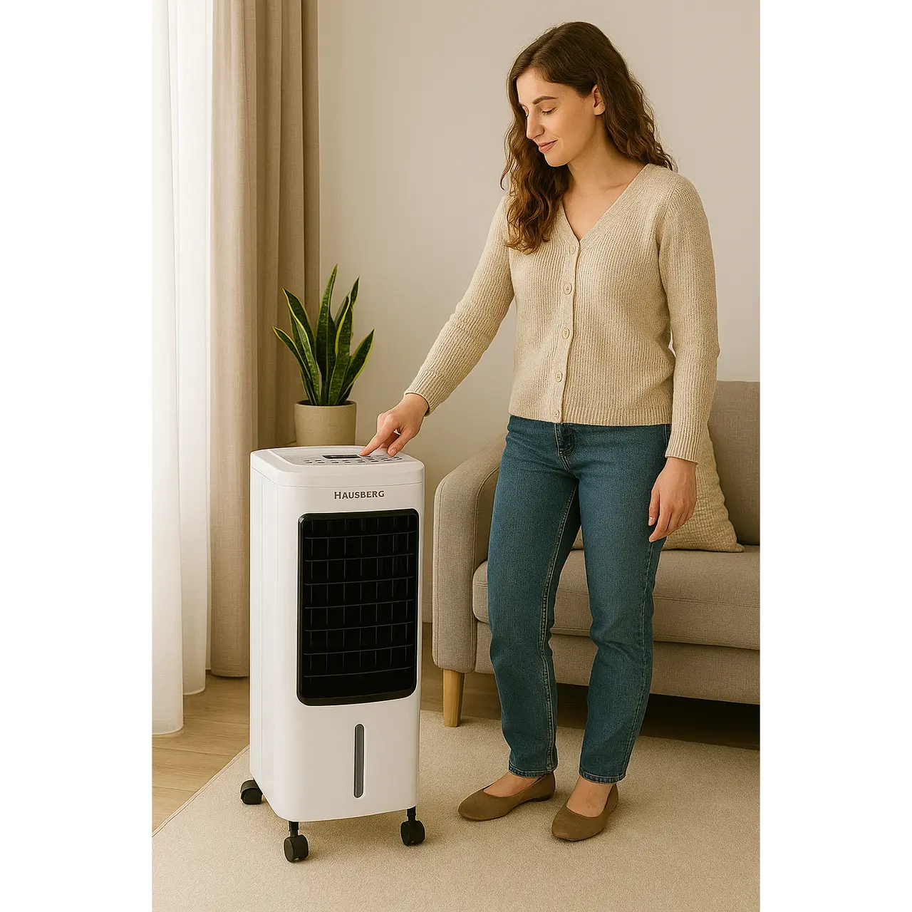 С 3 режима на вентилация и 3 регулируеми скорости, потребителите могат да персонализират желаното ниво на комфорт. Функцията за осцилиране отляво надясно разпределя равномерно охладения и овлажнен въздух в помещението. Устройството е оборудвано с LCD сензорен екран за интуитивно използване и включва интелигентно дистанционно управление, което позволява дистанционно управление.