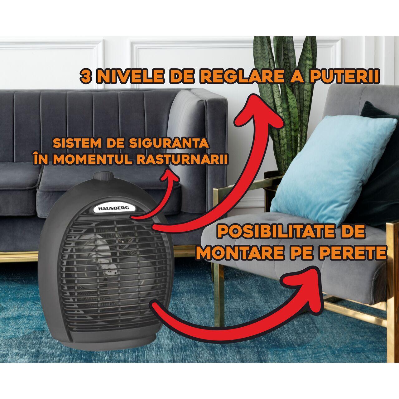 Aeroterma Hausberg HB-8505NG, 2000 W, 3 trepte de putere, sistem de siguranta, Negru