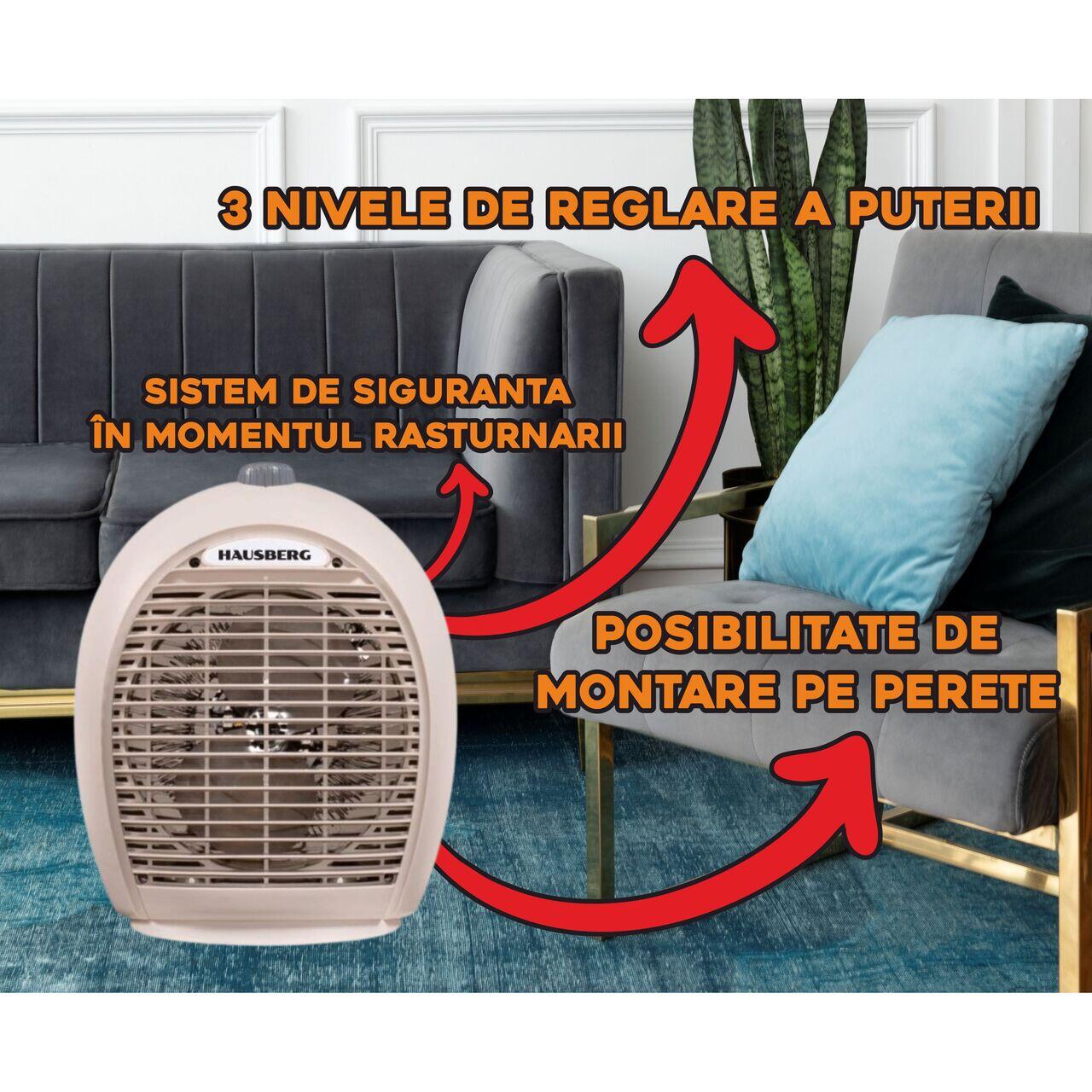 Aeroterma Hausberg HB-8504BJ, 2000W, 3 trepte de putere, termostat reglabil, protecție la răsturnare, montaj pe perete