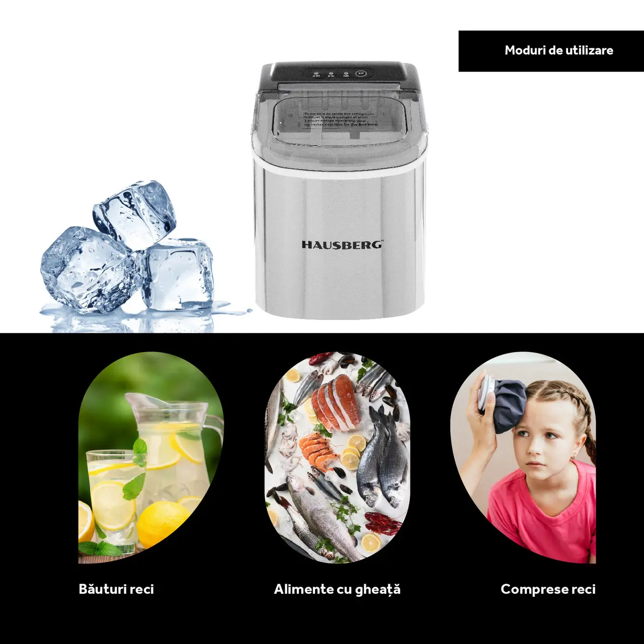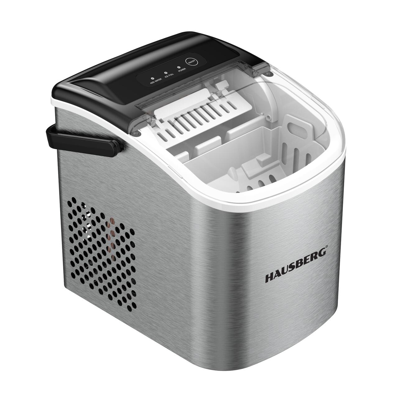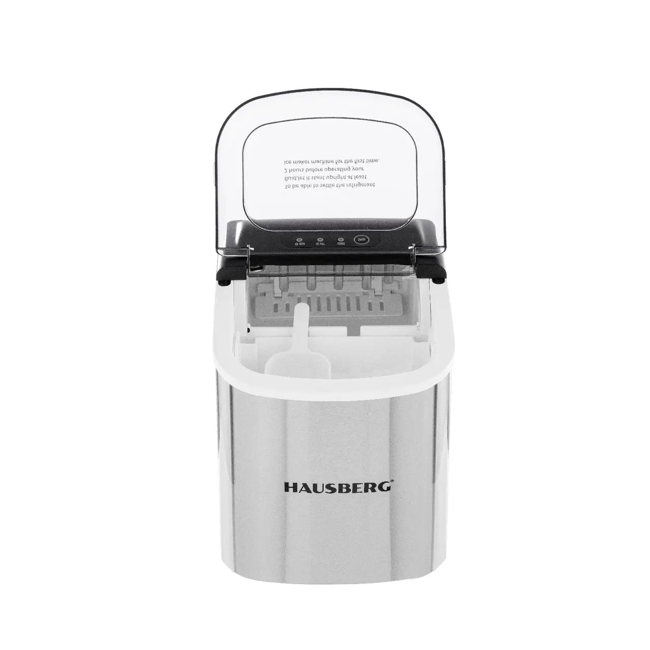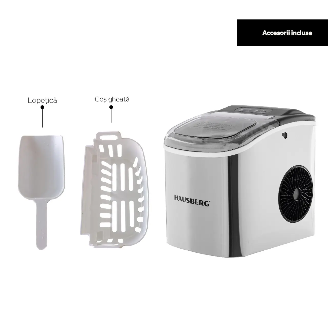 Aparat de preparat gheata HAUSBERG HB-6019IN, capacitate vas apa 1.2 litri, productie cuburi gheata 12-15 kg / 24 ore, capacitate de stocare 0.6 kg, 9 cuburi/6-9 min, argintiu