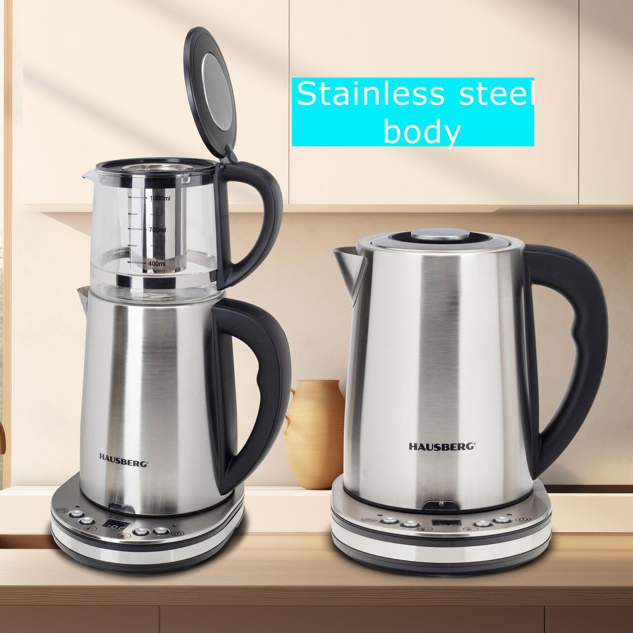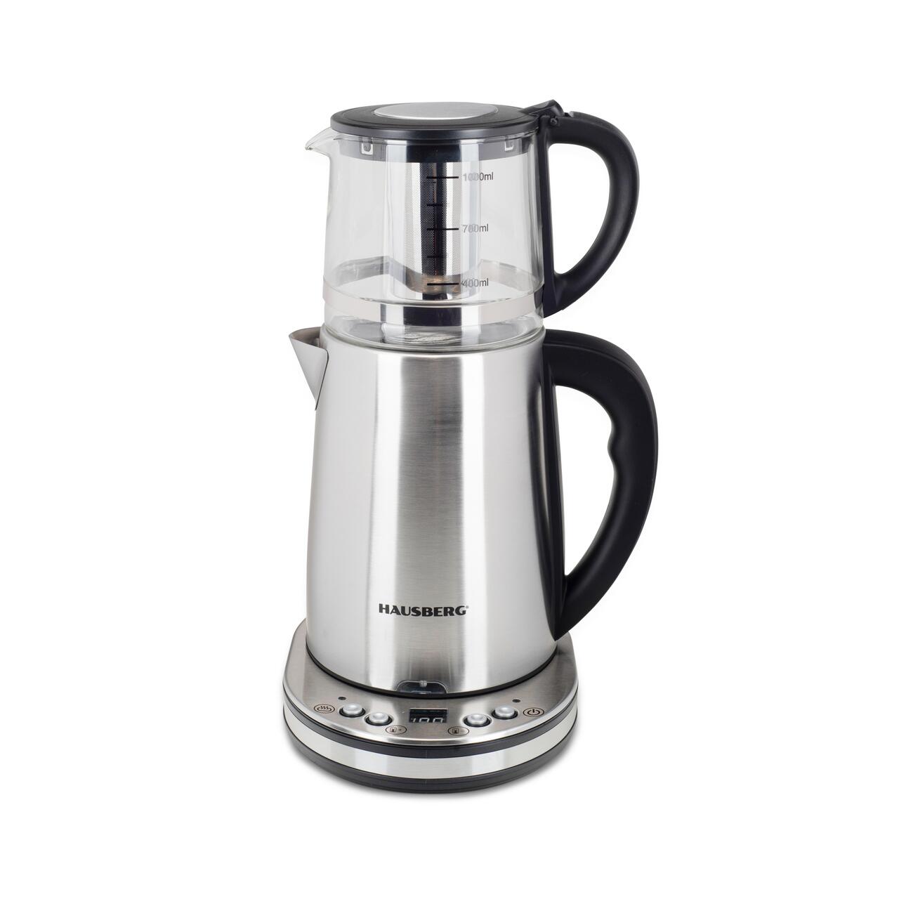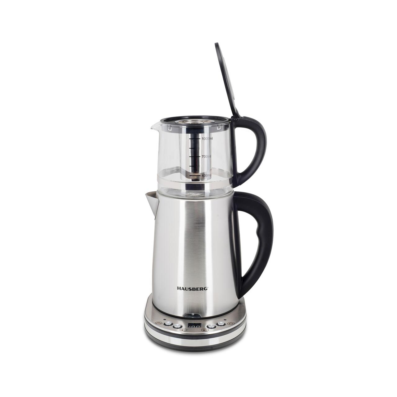 Aparat digital preparare ceai HAUSBERG HB-3640IN, 1500W, cana 1.7L, ceainic 1L, panou din otel inoxidabil cu afisaj digital, termostat, Inox