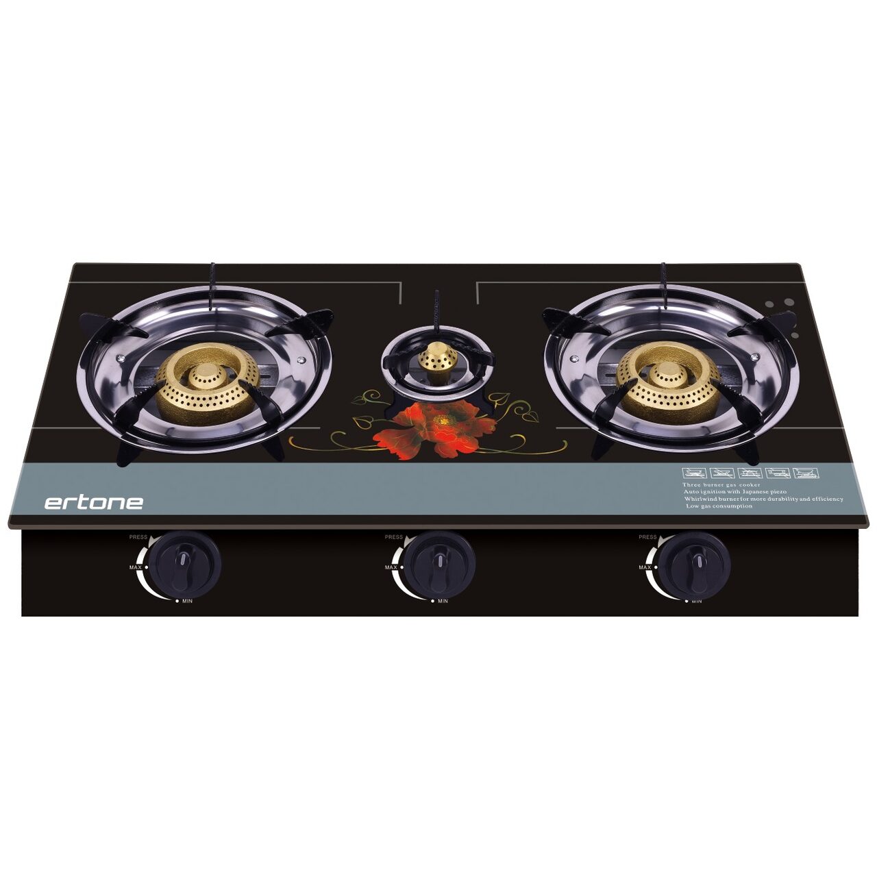 Aragaz ERTONE MN-1103 din sticla securizata, 3 Arzatoare din fonta, aprindere pe quartz, negru