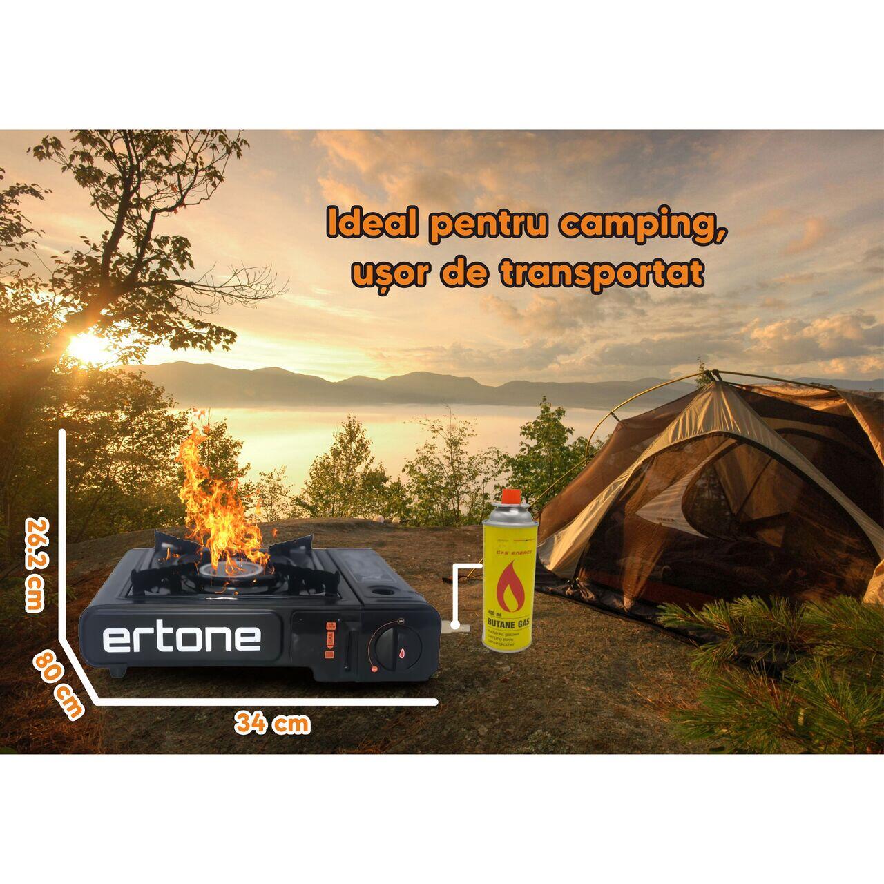 Aragaz portabil 2 in 1 camping Ertone ERT-MN232, Pentru butelie spray si standard, 2.2 kW, Aprindere piezo, Negru