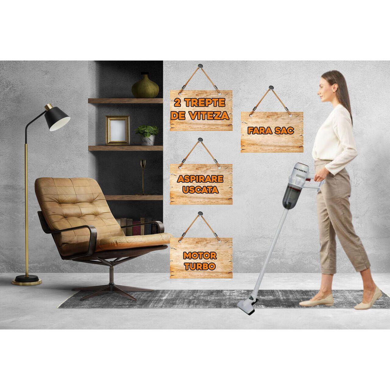 Aspirator vertical 2 in 1 HAUSBERG HB-2024GR, fara sac, aspirare uscata, 2 niveluri de viteza, motor turbo, 0.7 L, 600-800W, Gri