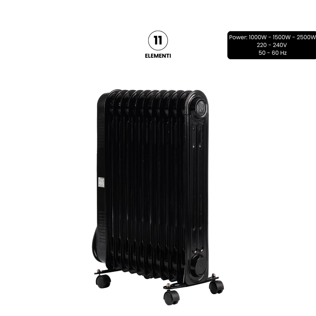 Calorifer electric cu ulei HAUSBERG HB-8925, 3 trepte, 1000-1500-2500 W, 11 elementi 110 mm x 580 mm, termostat reglabil, maner si rotite pentru o deplasare facila, indicator luminos functionare, negru
