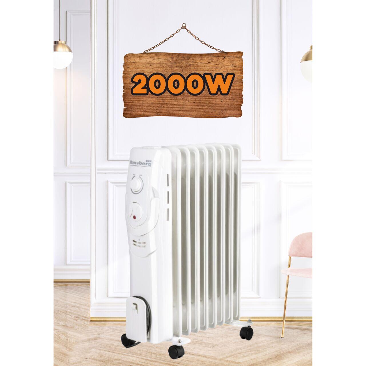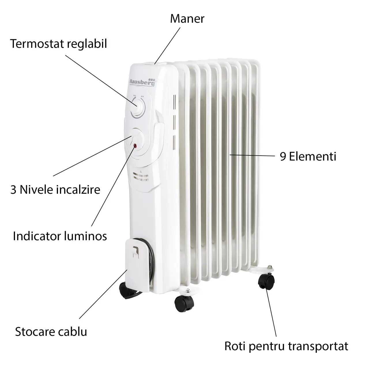 Calorifer electric cu ulei Hausberg HB-8910, 2000W, 9 elementi, 3 trepte de putere, termostat reglabil, protecție la supraincalzire