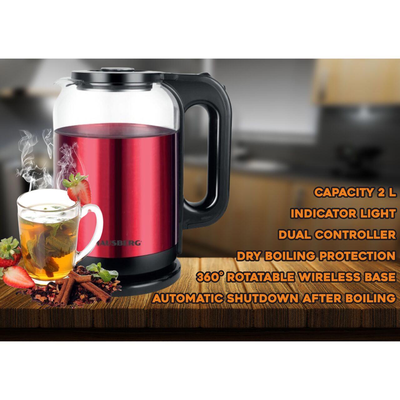 Cana electrica fierbator HAUSBERG HB-3622RS, 1500 - 1800W, capacitate 2L, oprire automata, indicator luminous, Rosu-Negru