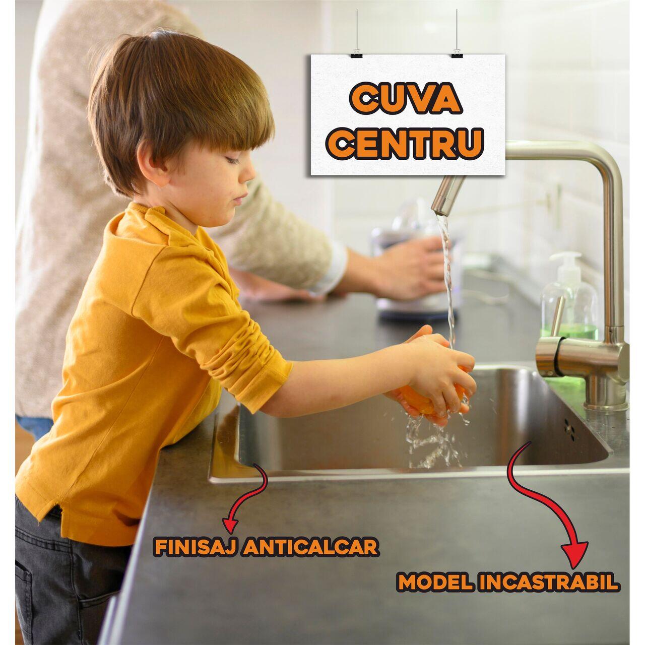 - Dimensiuni cuvă: 45x35 cm – oferă suficient spațiu pentru spălarea vaselor mari.