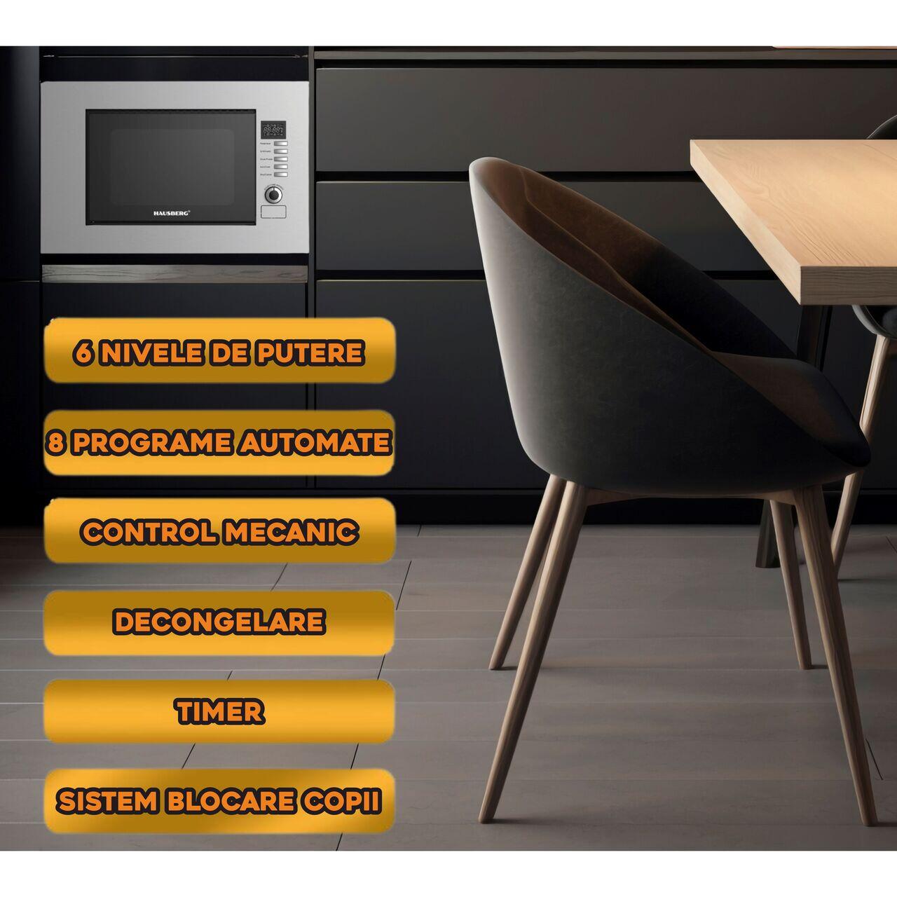Cuptor cu microunde incorporabil HAUSBERG HB-8065IN, 20 litri, Putere: 230V, 50Hz, 700W, 900W putere grill, 1200W putere de intrare, 6 nivele de putere, 8 programe automate, control mecanic, decongelare, timer, sistem blocare copii, argintiu