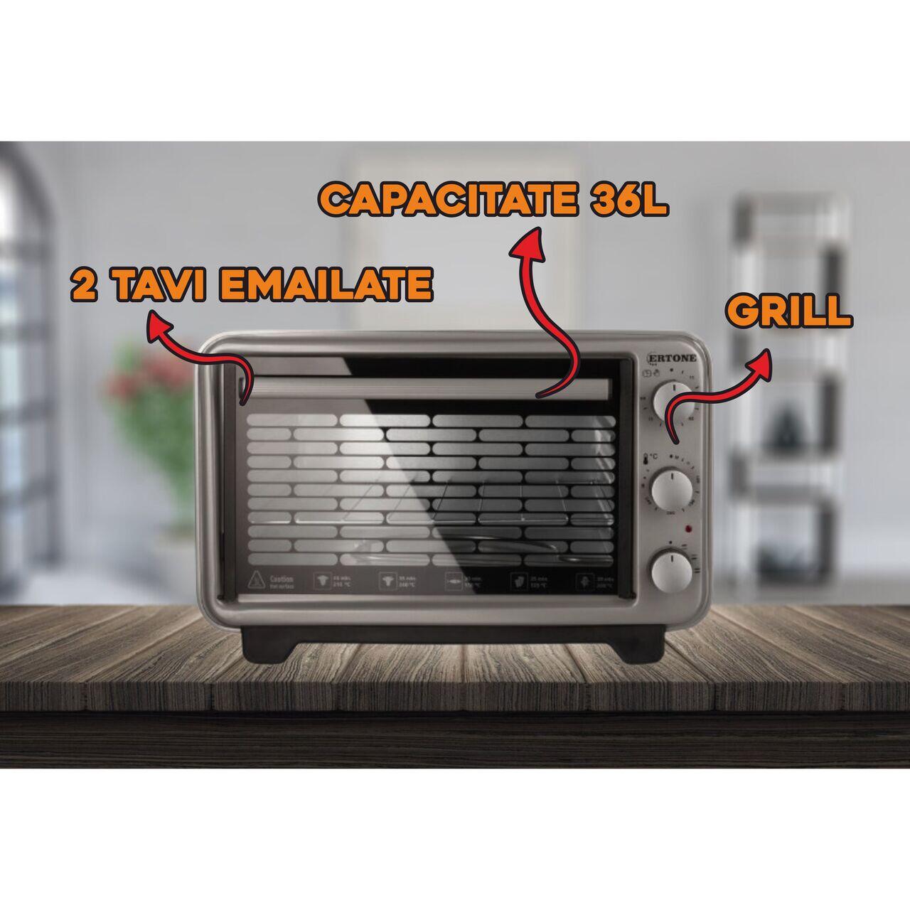 Cuptor electric Ertone MN9060GR, 36L, 1420W, Termostat, Cronometru, 2 tăvi emailate + grill, Rezistențe inox, Interior emailat, Gri