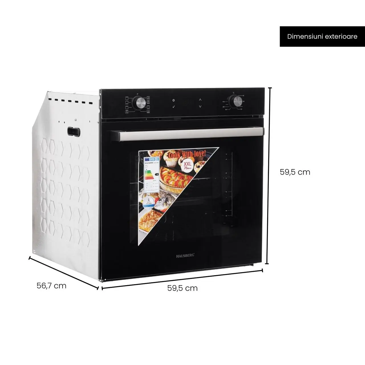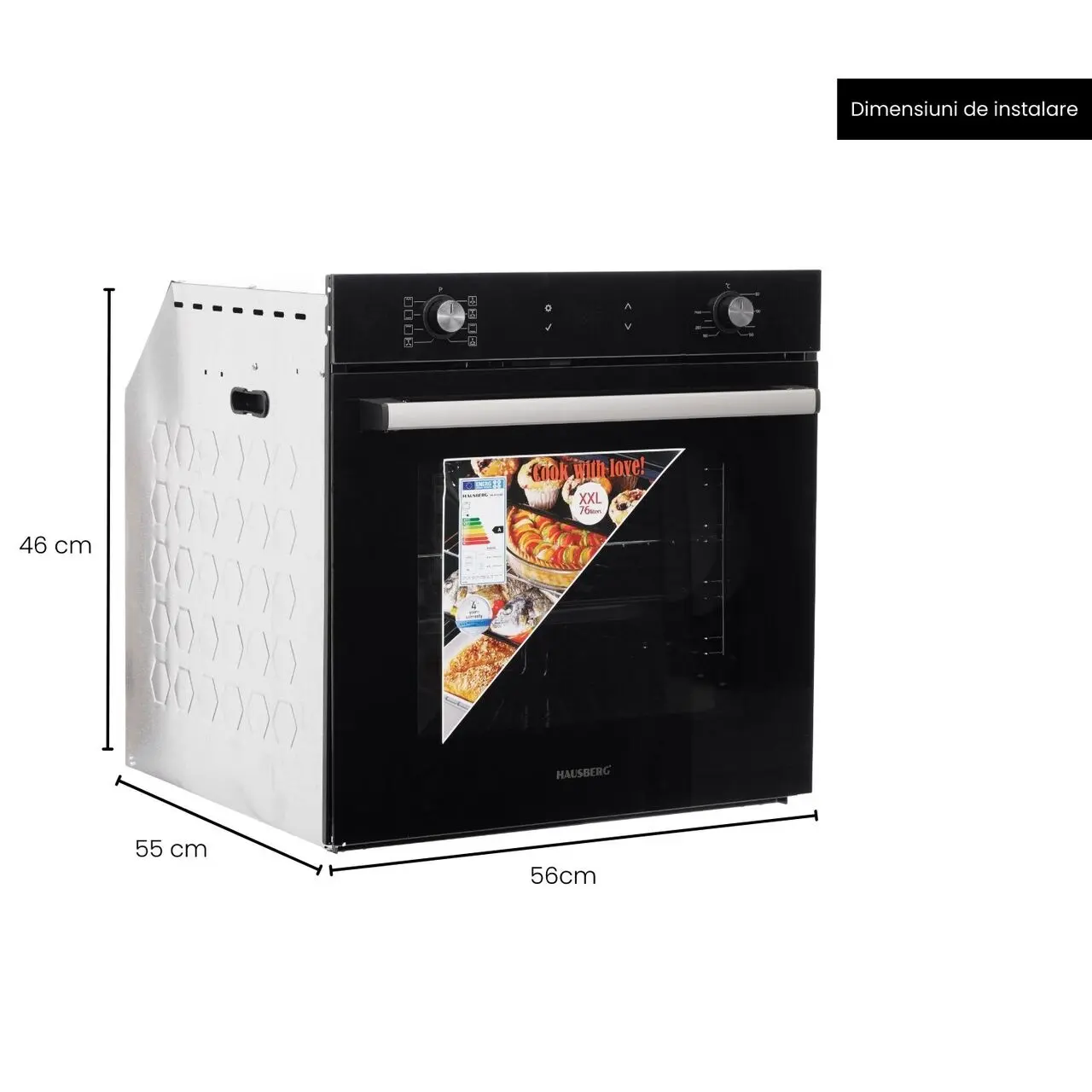 Cuptor electric incorporabil Hausberg HB-8054NG, Clasa A, volum 71L, putere 2225W, panou sticla termoizolant, termostat, timer, 8 functii, ventilatie, Negru