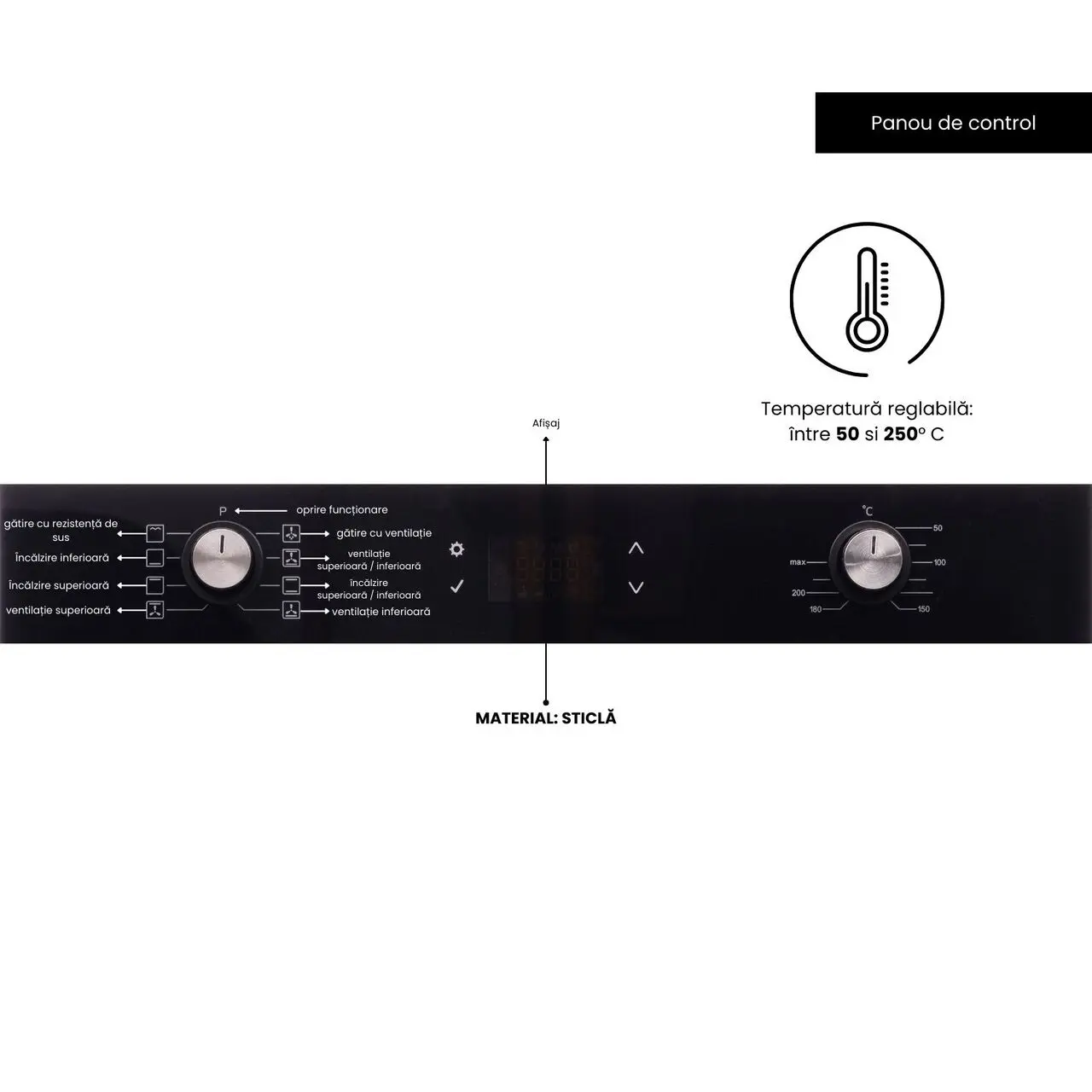 Control usor al setarilor cuptorului, butoane setare temperatura, functie si timer.