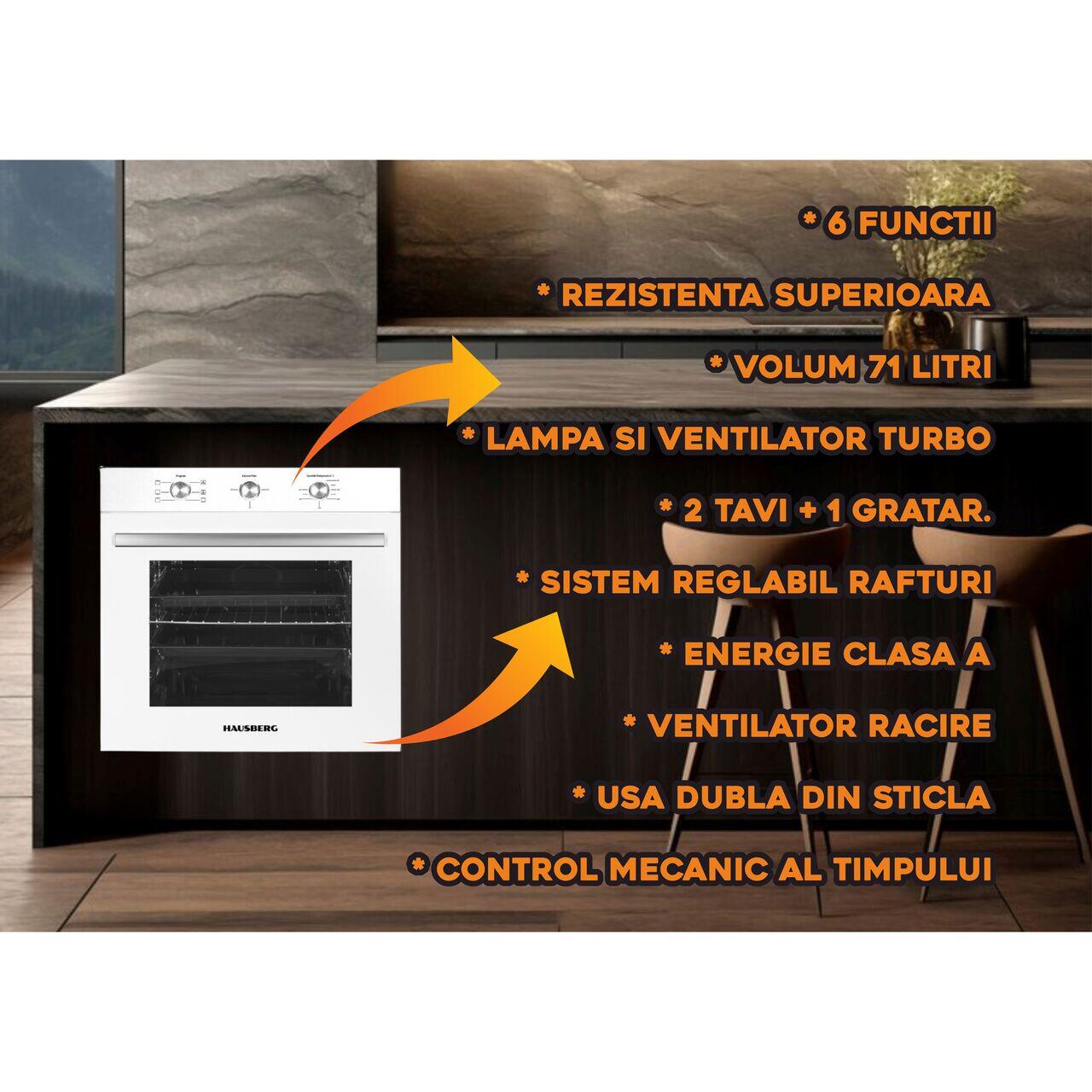 Cuptor incorporabil Hausberg HB-8053AB, Electric, Putere 2225 W, 71 l, 8 Functii, Ventilatie, Timer, Clasa A, Alb