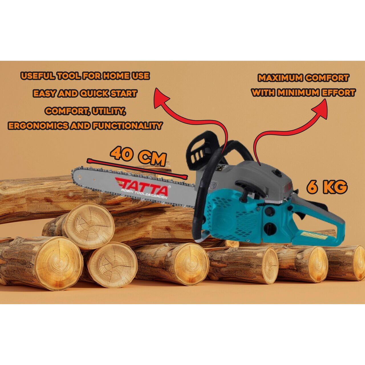 Drujba termica (motofierastrau) Tatta cu o putere de 2000 W si o lungime a lamei de 40 cm este o unealta utila pentru uz casnic fiind extrem de folositoare pentru a taia lemne de foc, cherestea sau pentru intretinerea si toaletarea copacilor. Avantajul motofierastraului este lipsa cablului de alimentare ceea ce permite mobilitatea uneltei. Acest motofierastrau este echipat cu un motor in doi timpi care utilizeaza drept combustibil un mix de benzina si ulei in raport de 25:1. Sistemul Easy Start asigura o pornire usoara si rapida a motofierastraului.