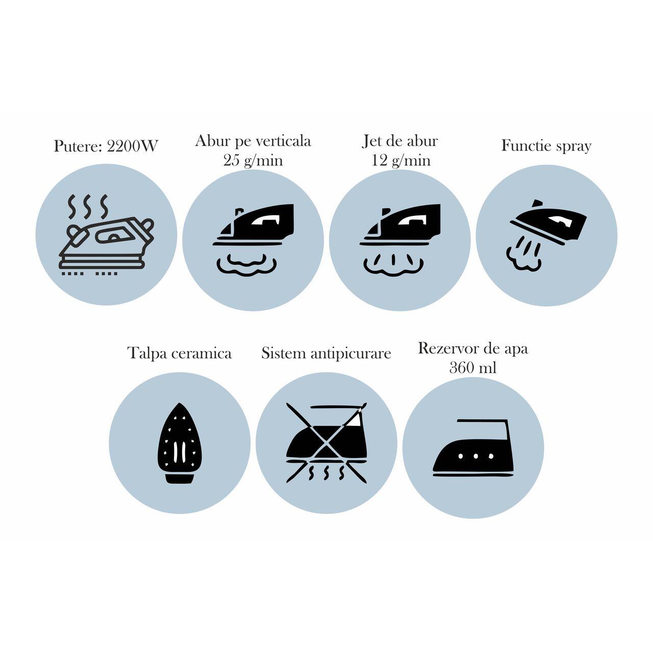 Fier de calcat Hausberg HB-7807VR, talpa ceramica, jet de abur 12g/min, abur pe verticala 25g/min, sistem antipicurare, sistem autocuratare, 2200W