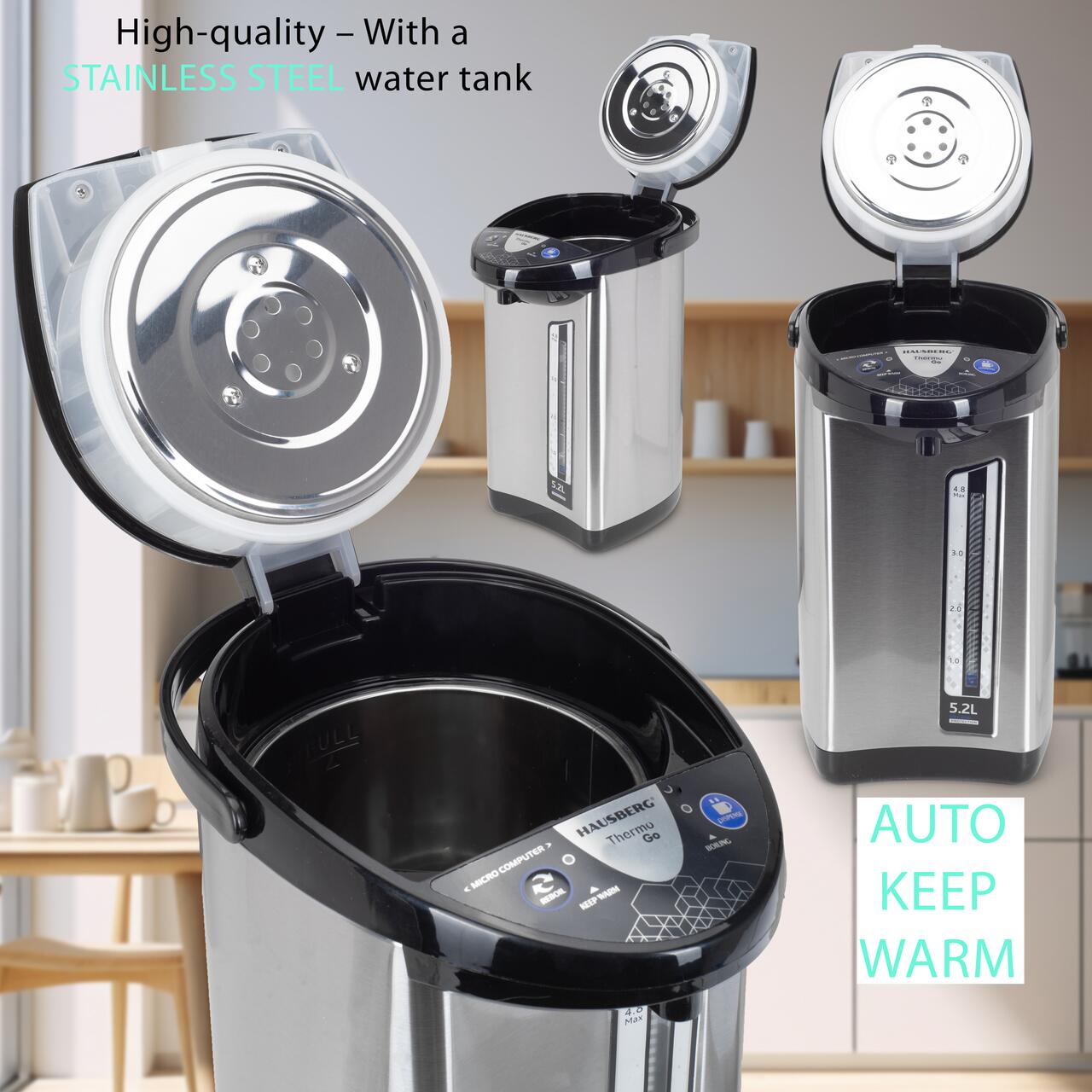 Fierbător Electric & Termos Hausberg HB-3645IN – 5,2L, Inox, Funcție 3 în 1, 750-900W 🔥☕