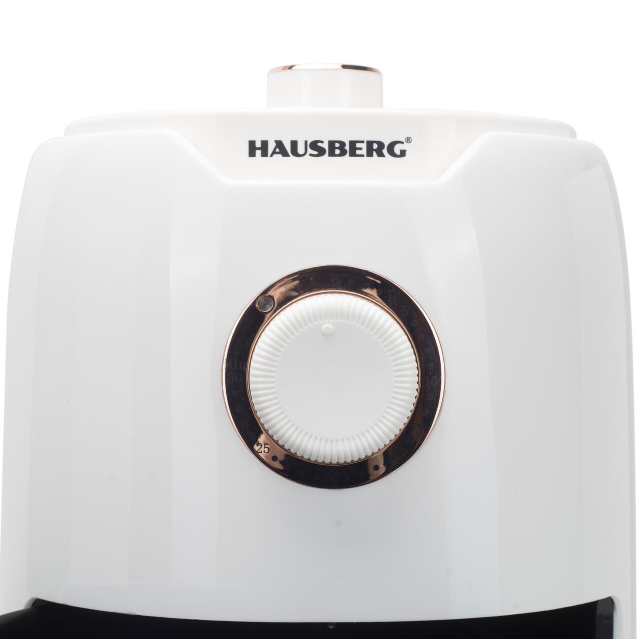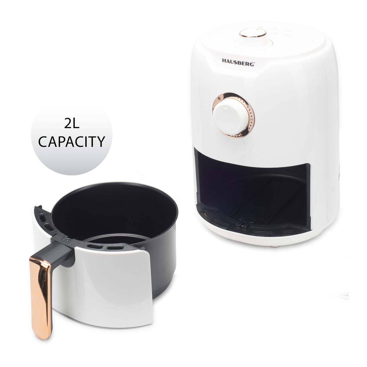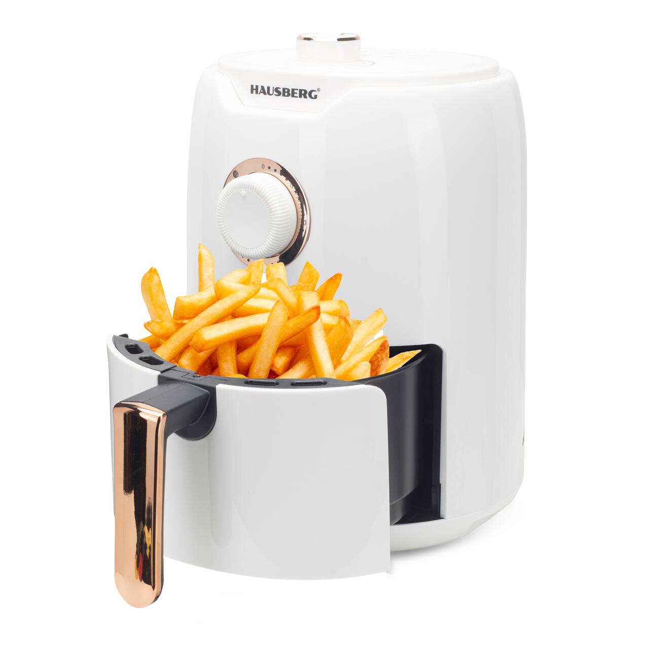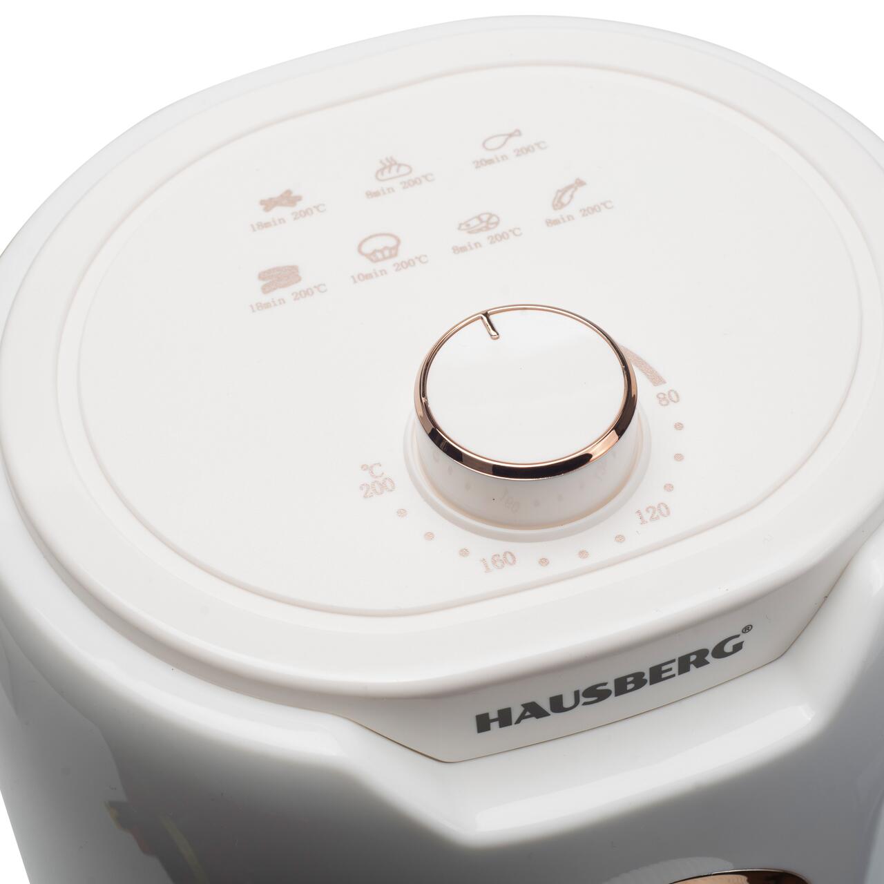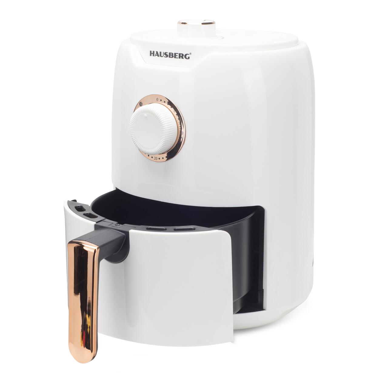 Friteuza cu aer cald HAUSBERG HB-2351, 1000-1200 W, 2.6 litri, temporizator 30 min, oprire automata, indicator luminos, termostat reglabil 80-200 grade C, protectie supraincalzire, picioare antiderapante, Alb