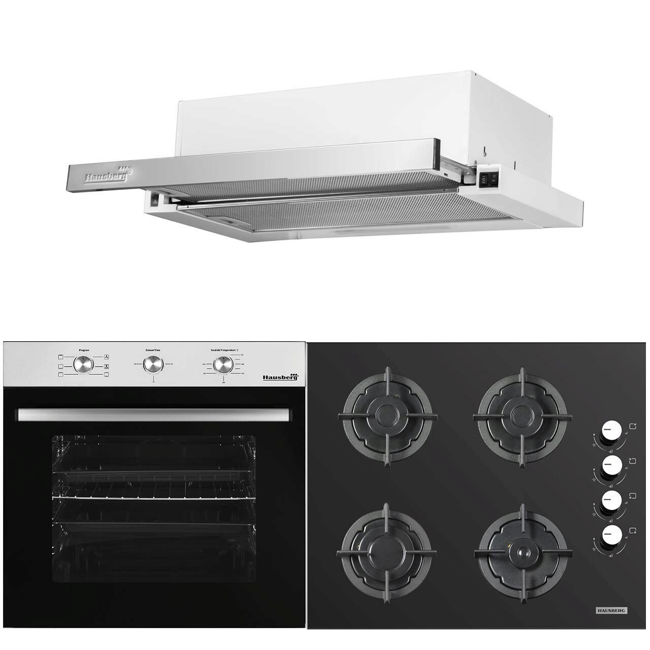 Pachet Cuptor electric Incorporabil Hausberg HB-8053IN, Clasa A, 71L, 2225W, Negru/Inox, Plita incorporabila HB-567NG, Gaz, 4 arzatoare, fonta, Sticla, Hota incorporabila telescopica HB-1285IN, Putere de absorbtie 420 m3/h, 2 motoare, 60 cm, Alb