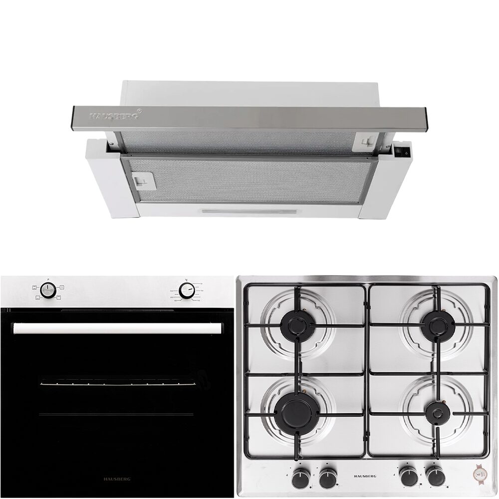 Pachet Incorporabil Cuptor electric Hausberg HB-8051IN, Clasa A, 76L, 2000W, Negru/Inox, Plita Incorporabila HB-555, 4 arzatoare, Gaz, Inox, Hota incorporabila telescopica HB-1285IN, Putere de absorbtie 420 m3/h, 2 motoare, 60 cm, Inox/Alb