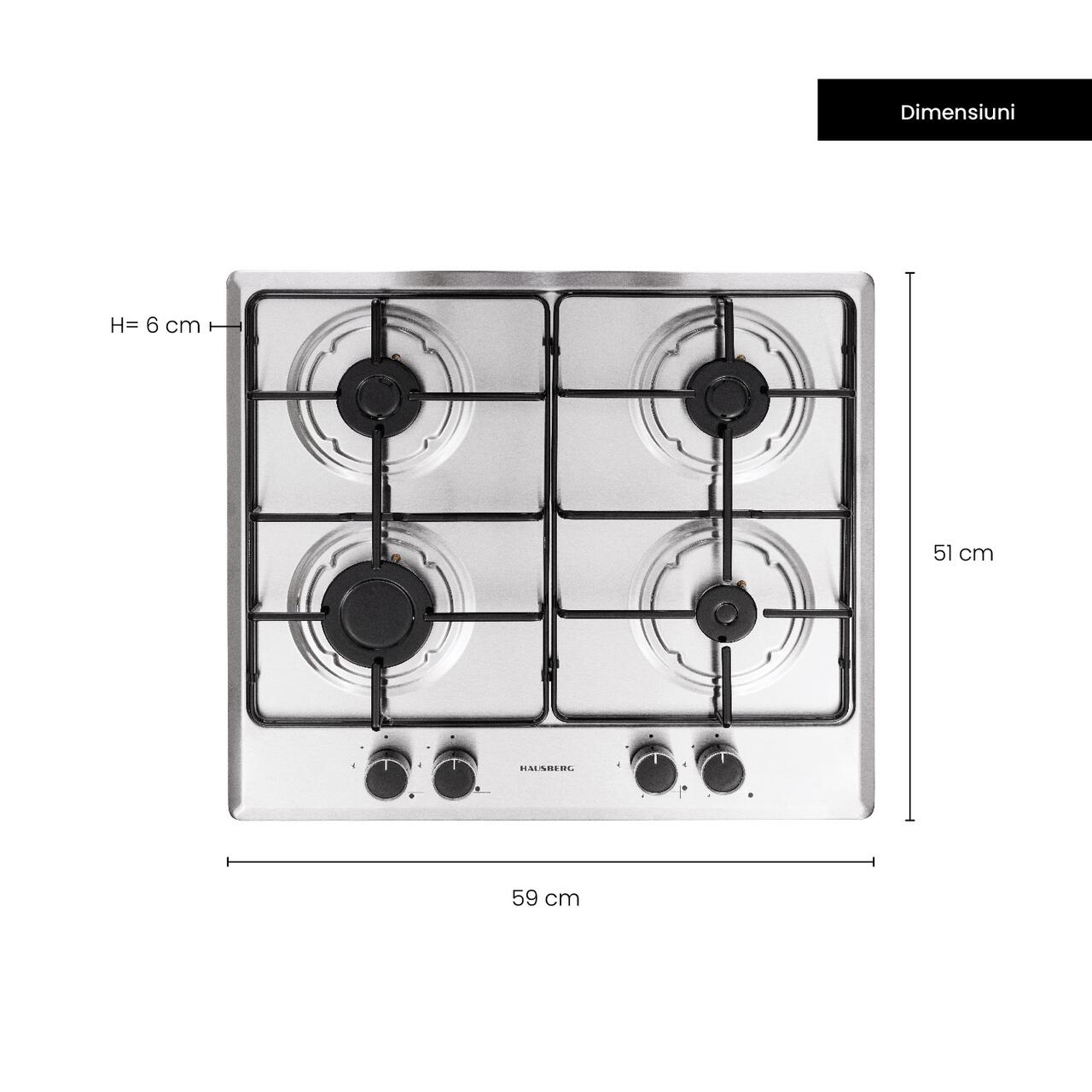 Plita incorporabila Hausberg HB 555, Gaz, 4 arzatoare, Sistem siguranta, Inox