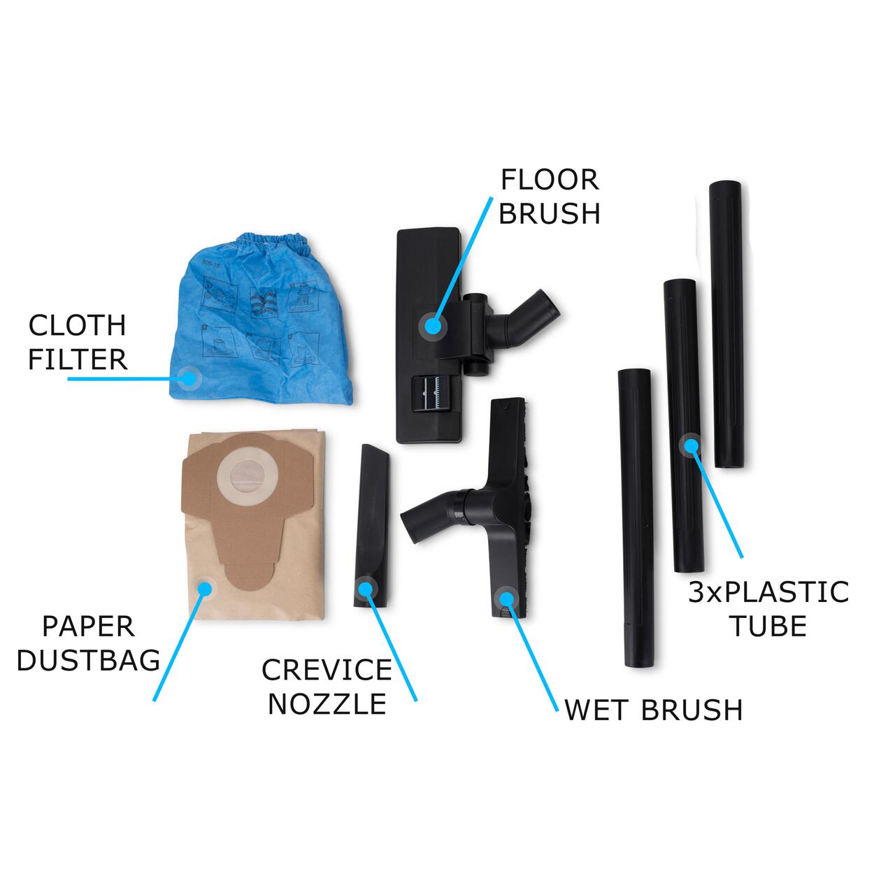 Accesorii multiple incluse: Furtun, tuburi de plastic, perie pentru podea, perie umedă, duză pentru crăpături, filtru cu burete, sac de hârtie pentru praf, filtru de pânză.