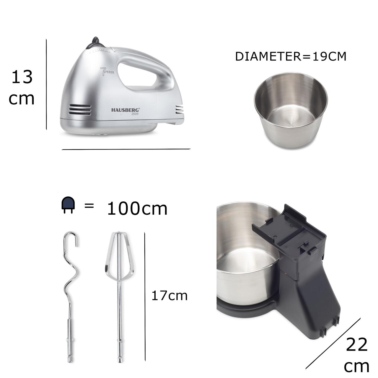 Mixer Cu Bol HAUSBERG HB-3551NG, 7 viteze, putere 250W, BOL DIN INOX DE 2L, Negru