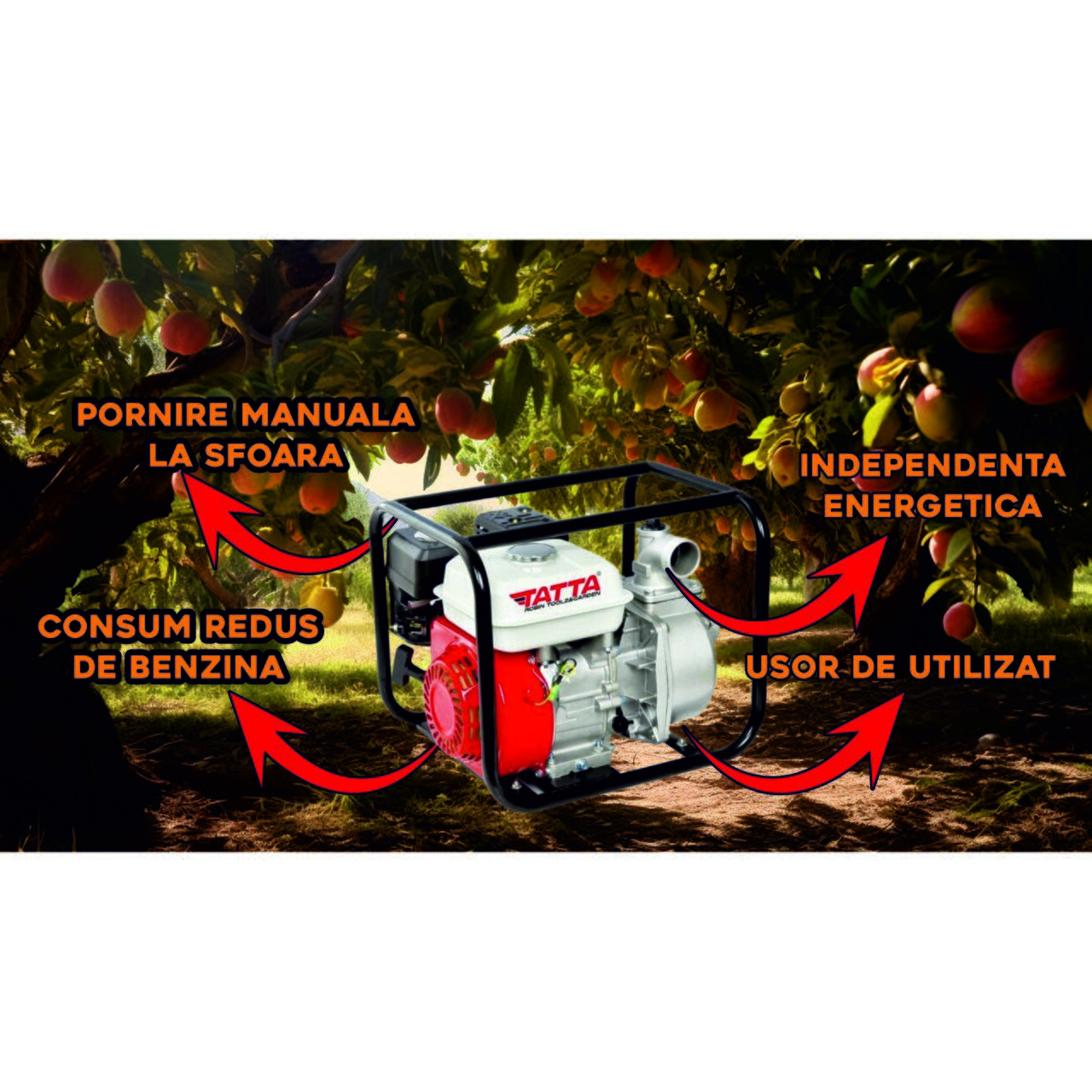 Motopompa Tatta TT-PA306 este destinata special pentru pomparea apei din lacuri si pentru irigatii. Bazinul de pompare (carcasa pompei) este auto-amorsabila, fara ca utilizatorul sa amorseze intreaga coloana de furtun, astfel timpul de livrare al apei este imediat.