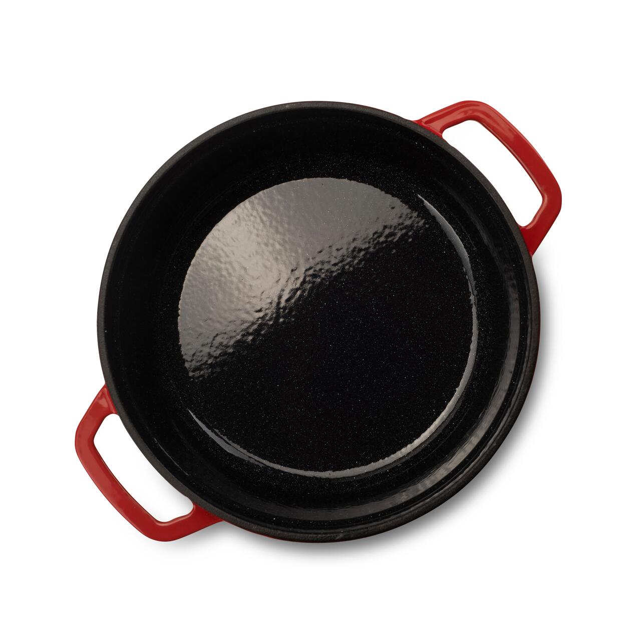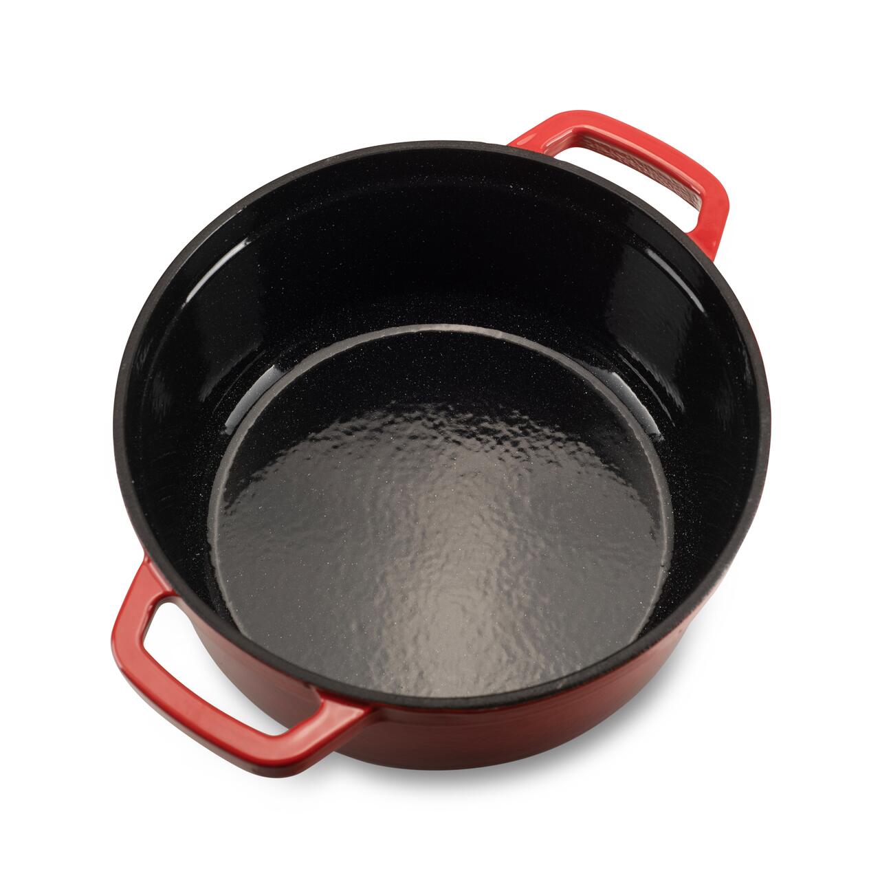 Interiorul antiaderent, de culoare negru strălucitor cu puncte albe, împiedică lipirea alimentelor și facilitează curățarea. Exteriorul este acoperit cu un strat dublu de smalț roșu, oferind rezistență crescută și un aspect elegant.