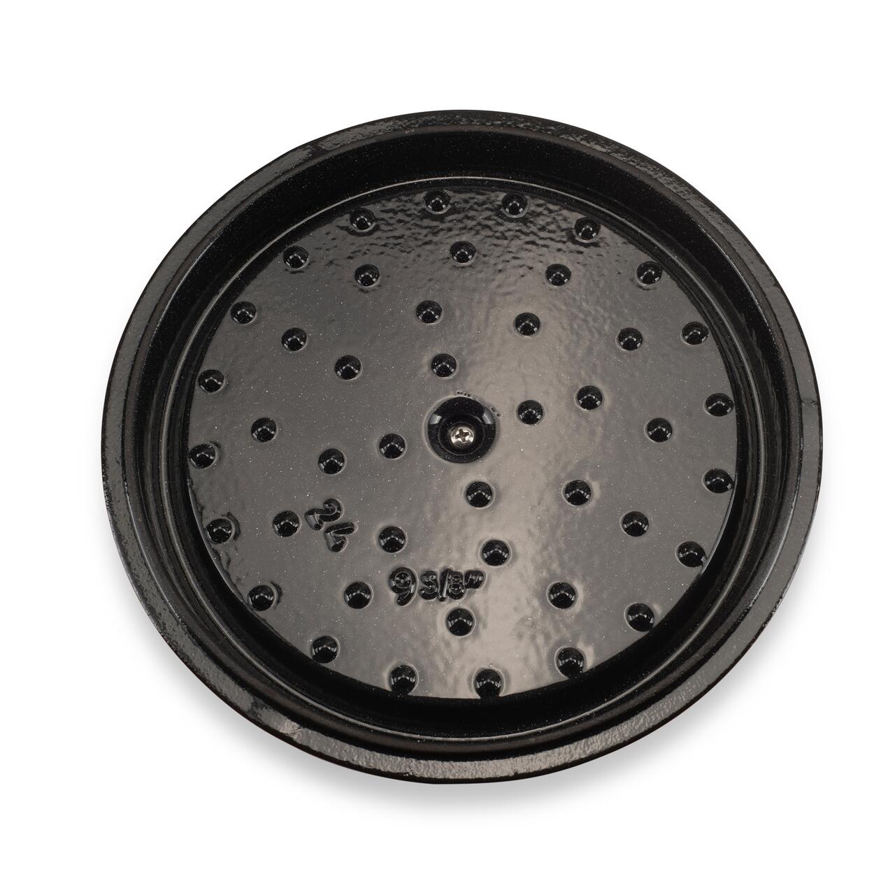 Capacul greu, tot din fontă, asigură o etanșare excelentă, menținând căldura și aburii în interior pentru a găti uniform și a intensifica gustul preparatelor. Mâncarea rămâne fierbinte pentru o perioadă lungă după gătire, continuând procesul de maturare a aromelor.