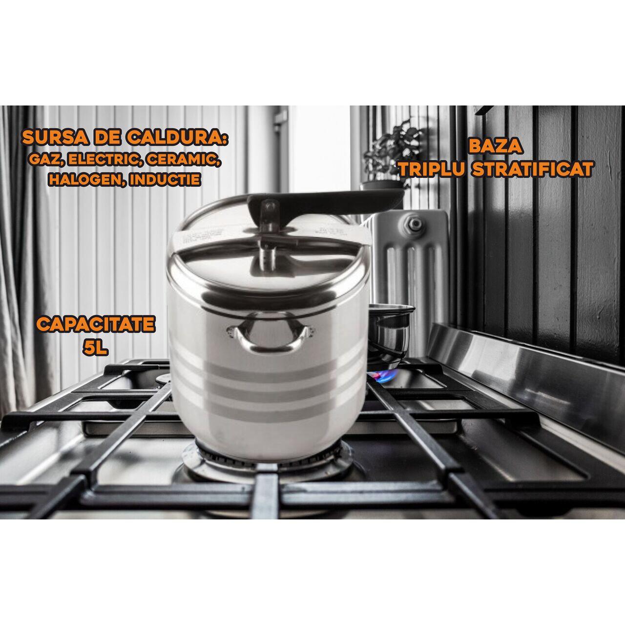 Pastreaza valorile nutritive si minerale din alimente. Manerele sunt nituite si parte integranta din produs.. Indiferent daca esti sau nu un bucatar profesionist, oala sub presiune, te va ajuta sa pregatesti mancaruri extraodinare, fara prea mult efort. Incalzeste rapid si mentine eficient temperatura datorita, datorita bazei in 3 straturi, scade considerabil timpul de fierbere. Capacul dispune de doua supape, una fiind pentru siguranta.