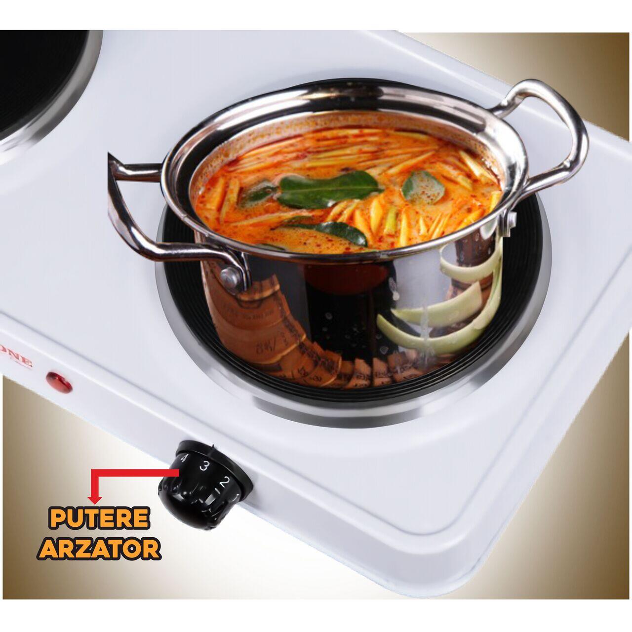 - Putere totală: 2000W – puterea combinată a celor două arzătoare asigură o încălzire rapidă și eficientă pentru prepararea mâncărurilor.