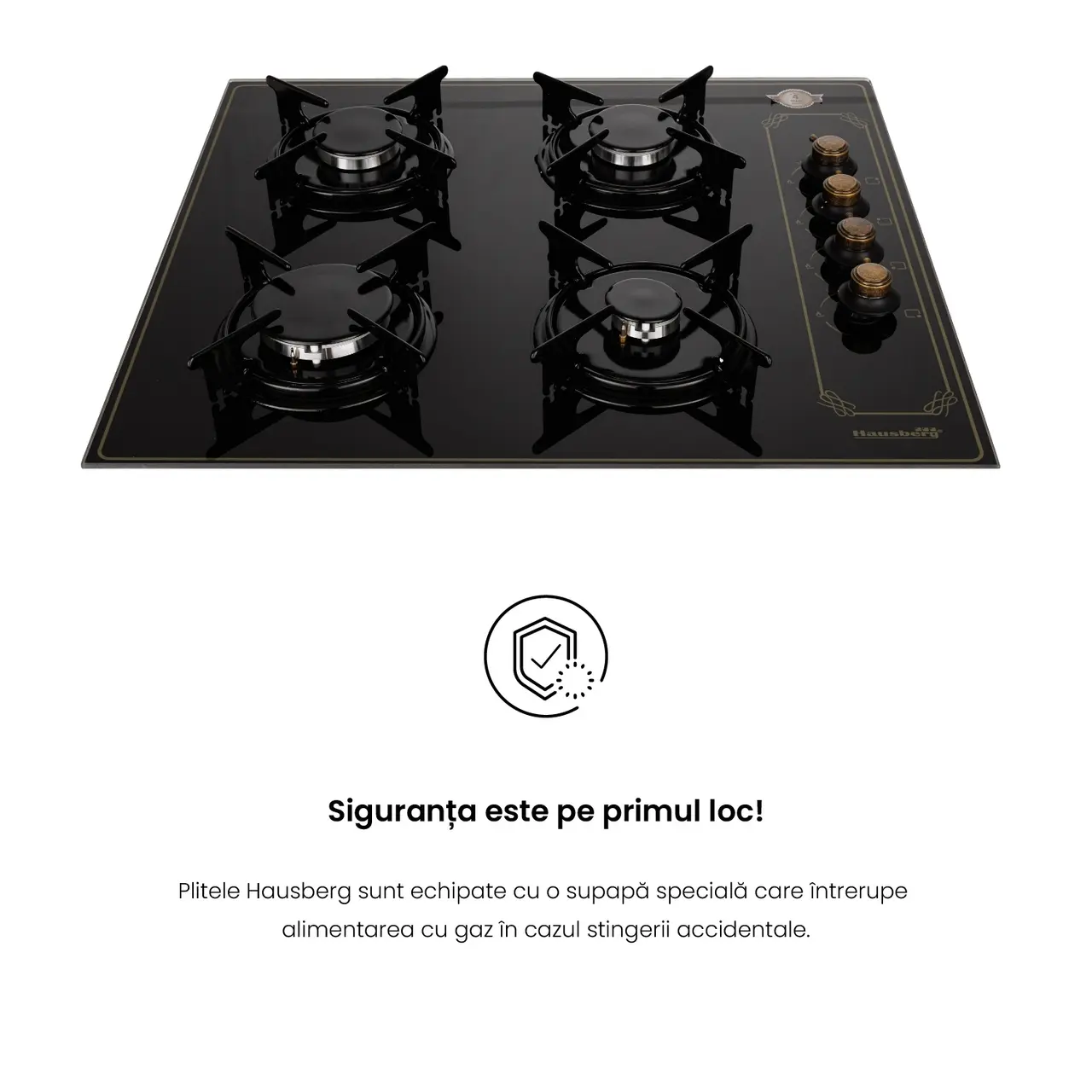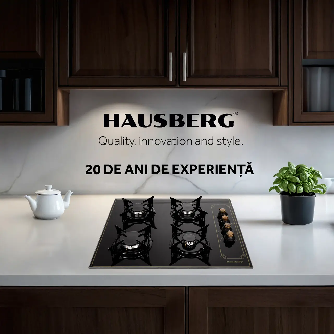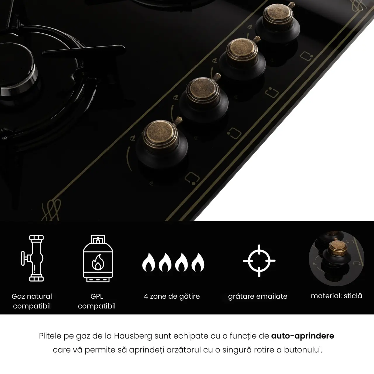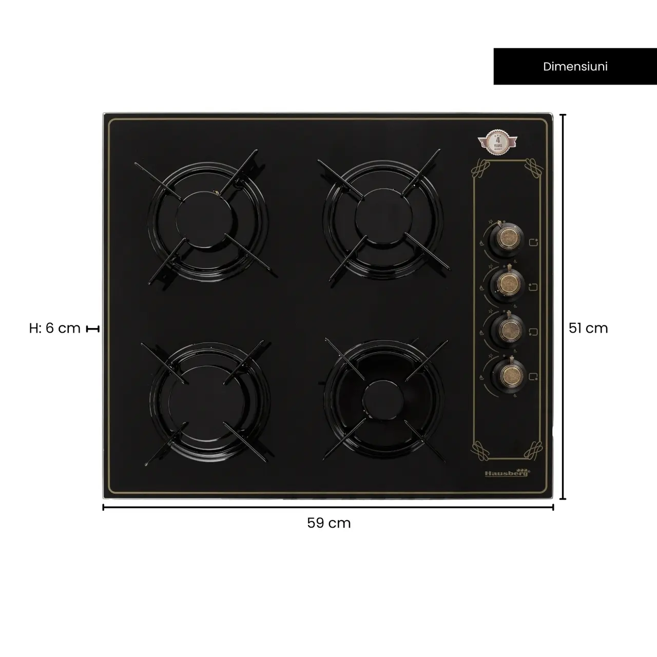 Plita Incorporabila Rustica Hausberg HB-575RST, 4 arzatoare, Gaz, 60 cm, Negru