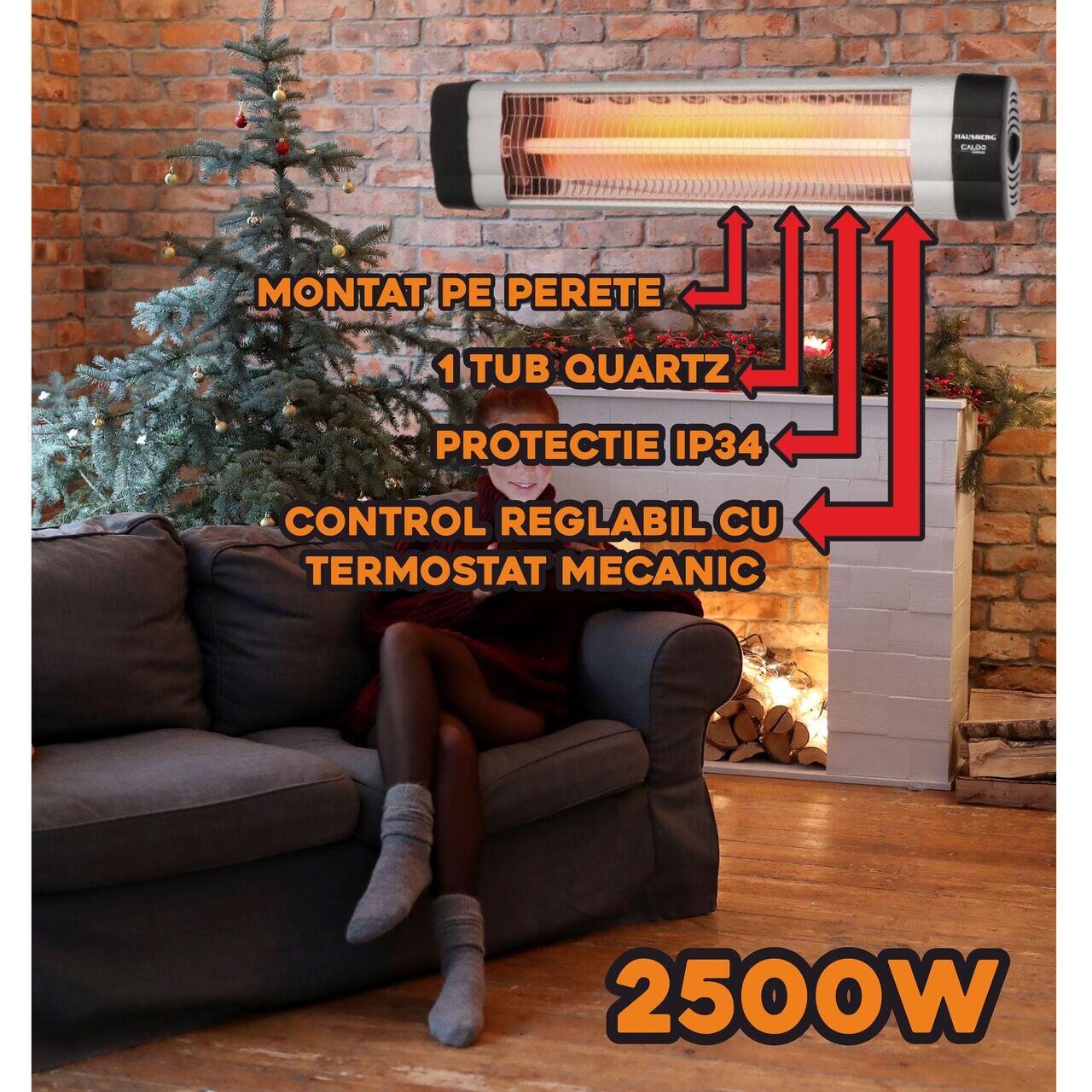 Cu o putere de 2500W ⚡ și protecție IP34 🛡️ împotriva stropilor de apă, aparatul este sigur, durabil și rezistent, fiind potrivit și pentru utilizarea în spații semi-exterioare. Montajul pe perete 📏 economisește spațiu și asigură o distribuție optimă a căldurii.