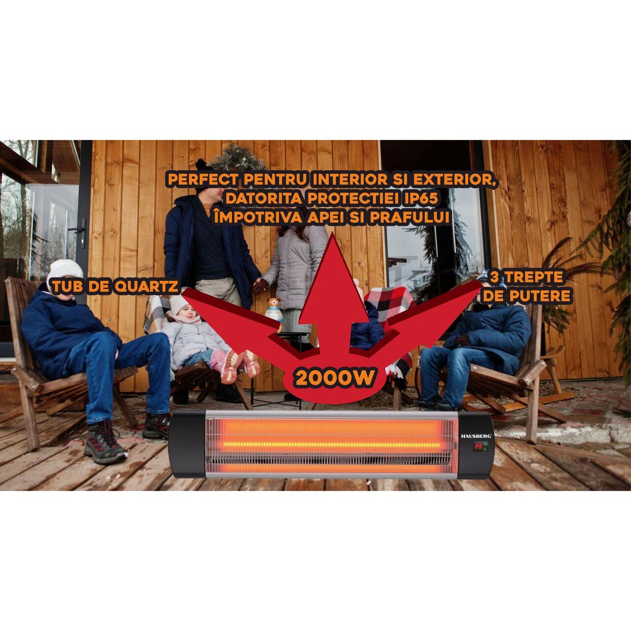 Radiator electric digital cu infrarosu Hausberg HB-8553, 2000W, Telecomanda, 1 tub quartz, 3 trepte putere, protective IP65, material carcasa din aluminiu oxidat