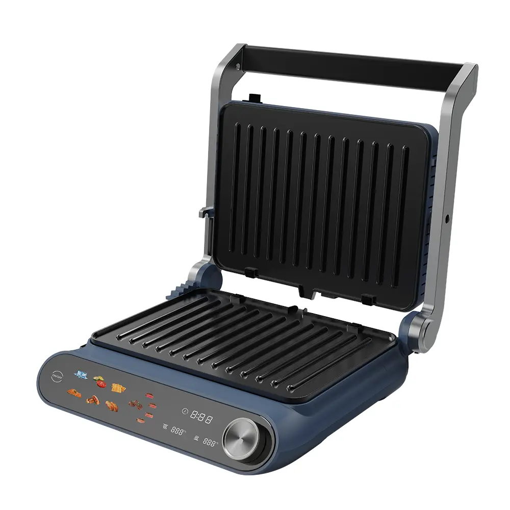 Sandwich Maker 2 in 1 HAUSBERG HB-635, Putere 2200 W, Placi pentru sanwich si grill, Acoperite cu strat anti-aderent, Ecran tactil digital, 7 programe diferite de gatit, Culoare Albastru/Gri