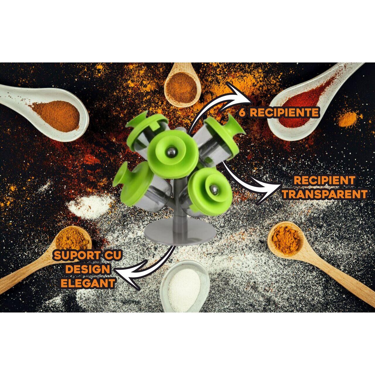 Contine 6 recipiente din plastic cu capac, pentru depozitarea de condimente si un stand din plastic.