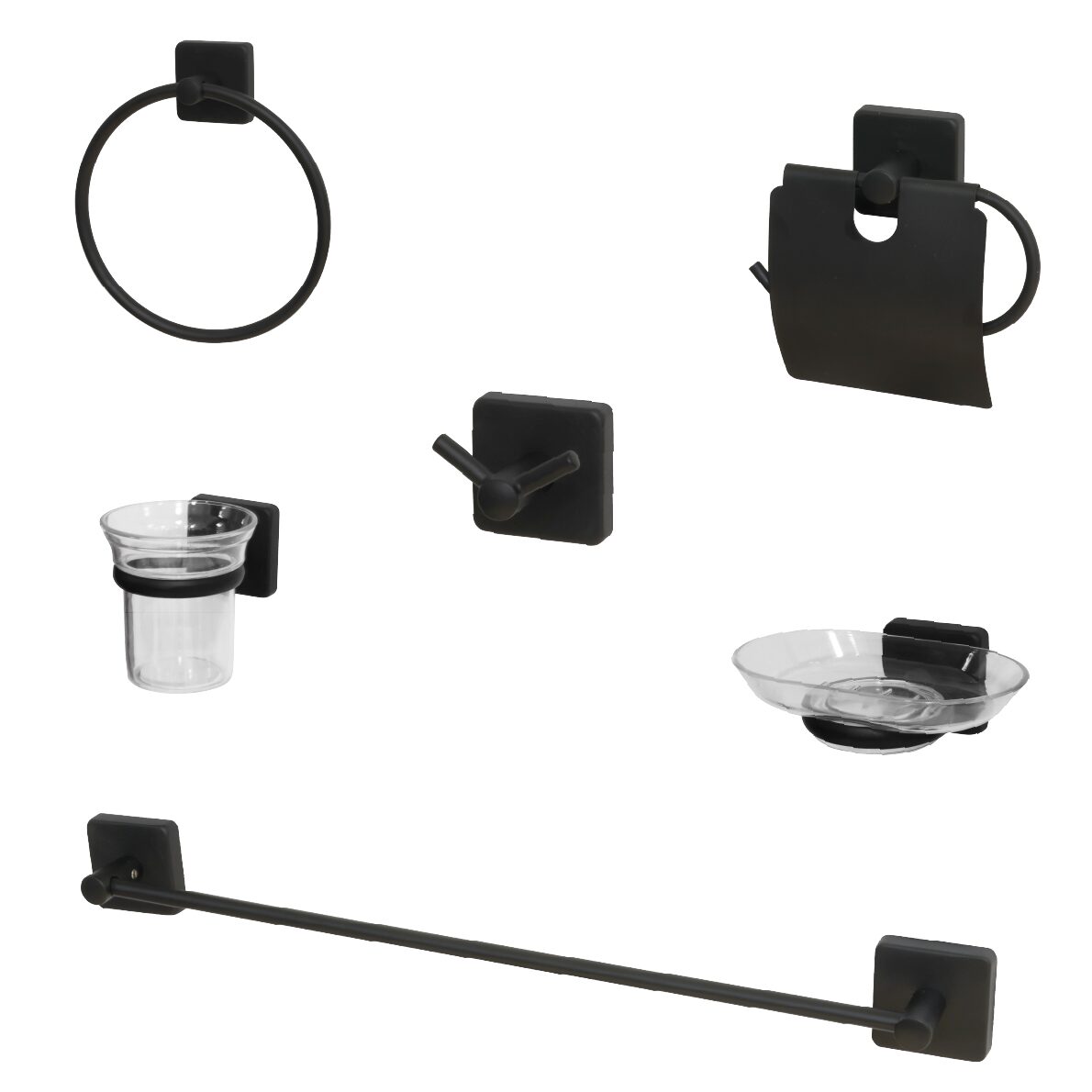 Acest set de accesorii pentru baie, cu un design modern și elegant în culoarea negru mat, aduce un plus de stil și funcționalitate oricărui spațiu de baie. Setul include toate elementele esențiale pentru organizare și acces facil, fiind realizat din materiale durabile, care rezistă bine în mediul umed specific băii.
