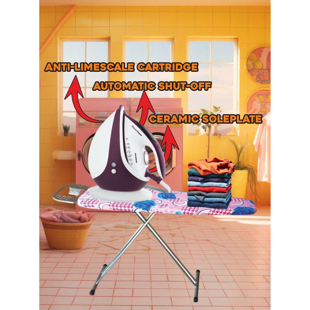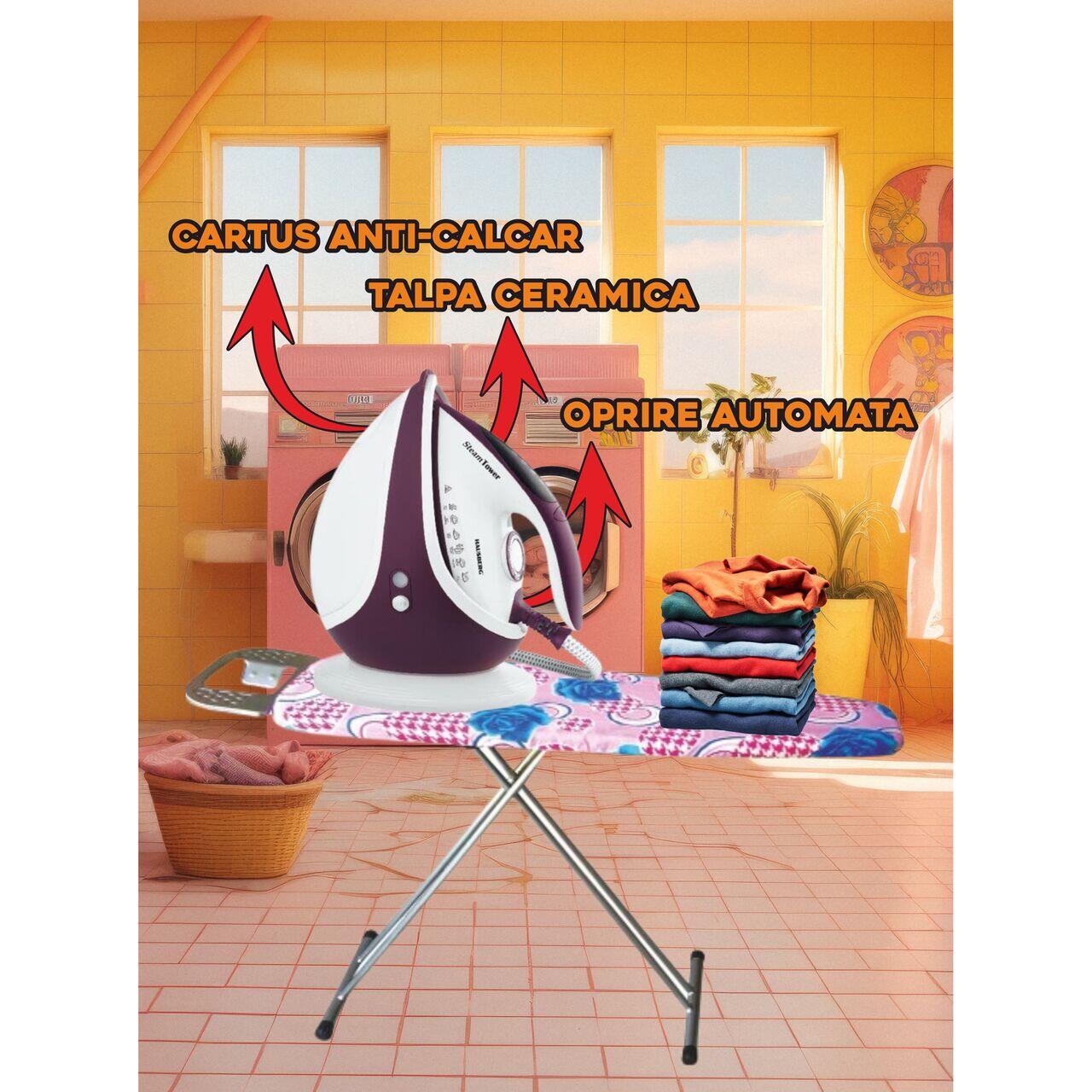 Statie de calcat HAUSBERG HB-7930MV, 2000-2400 W, 5 bar, 1.2 L, 35g/min, cartus anti-calcar, talpa ceramica, oprire automata, Alb/Mov