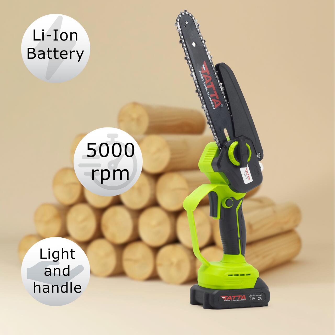 Mini drujba TATTA TD-5310, fierastrau electric cu acumulator 8”, 21V, portabila, teiere lemn, compacta