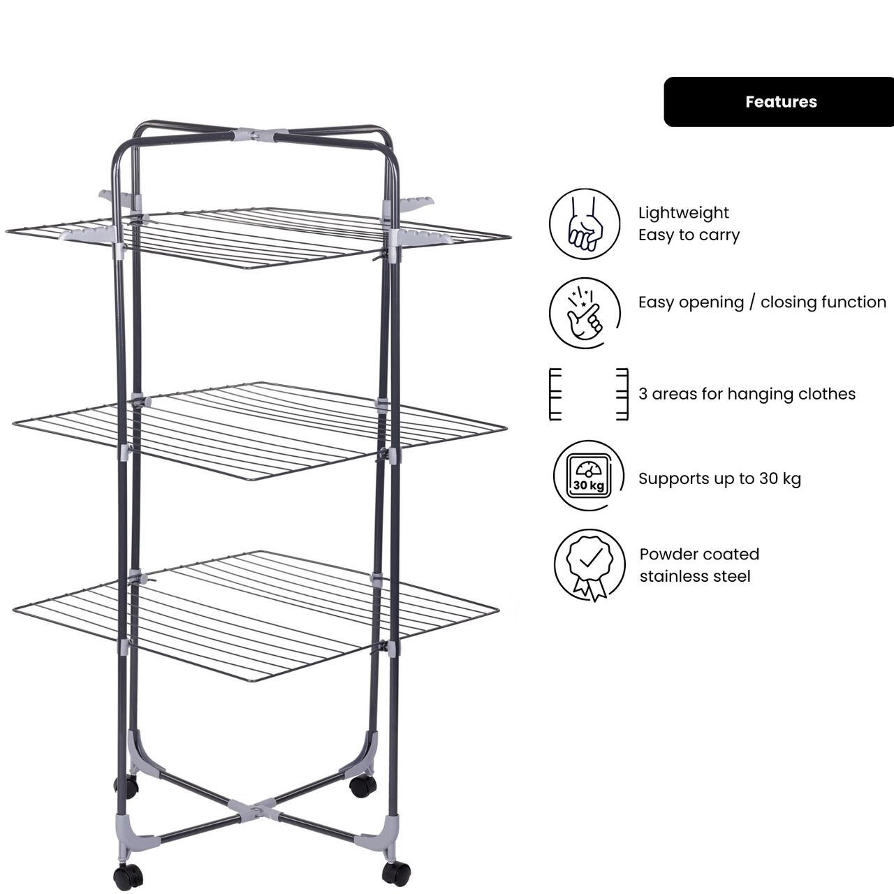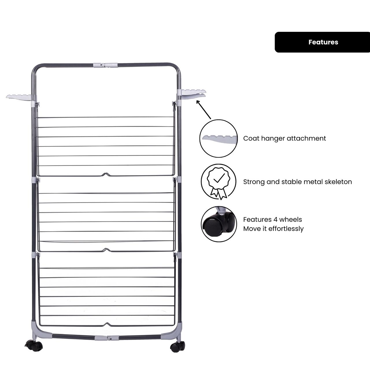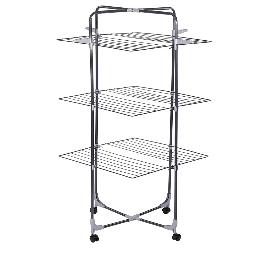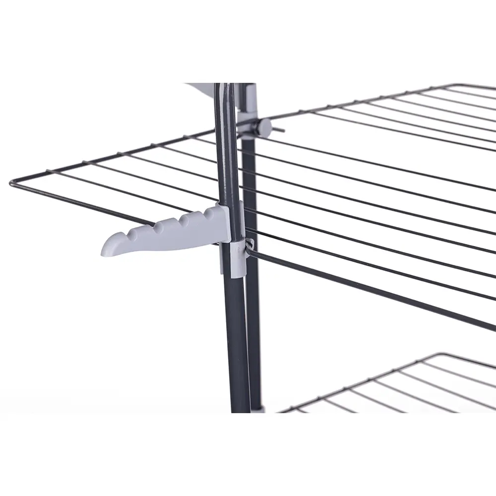 - Cu un schelet metalic solid, este perfect pentru uscarea rufelor într-un mod practic și eficient, ocupând foarte puțin spațiu. Fiind pliabil, este ușor de transportat și depozitat atunci când nu este utilizat.