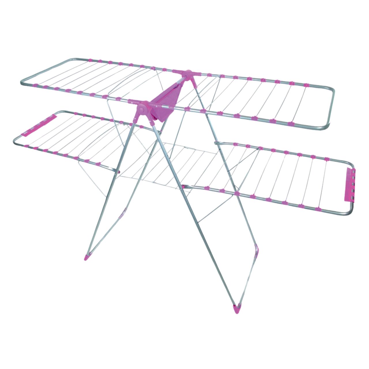 Designul său dublu permite utilizatorilor să utilizeze ambele părți ale uscătorului simultan, ceea ce îl face ideal pentru familii numeroase sau pentru cei care au o cantitate mare de rufe de uscat. Structura sa metalică rezistentă și robustă susține în mod sigur hainele și rezistă la utilizare îndelungată.